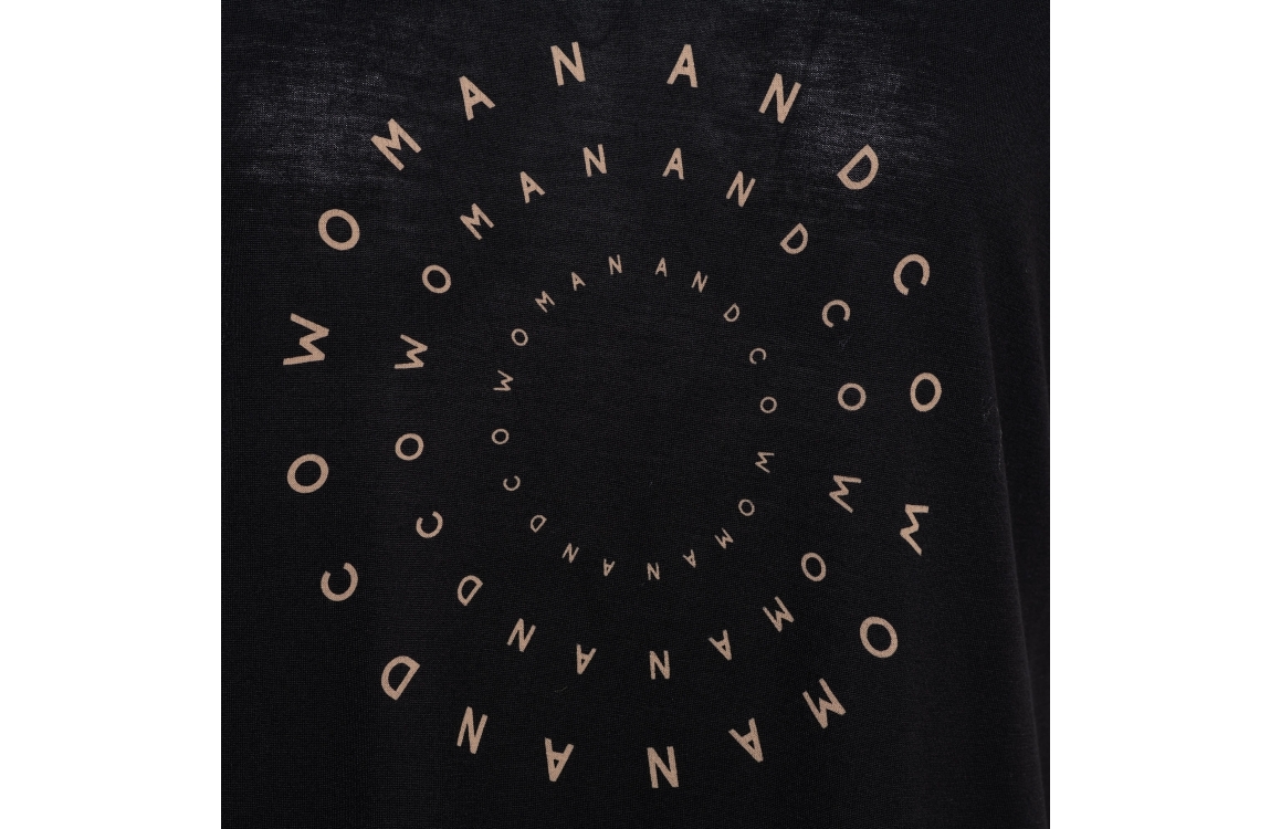 Co Woman SIGNY 56050 a-black. Dit rechtvallende model heeft een ronde hals en korte mouwen. Dit zwarte T-shirt van &Co Woman is op het voorpand bewerkt met een tekstuele opdruk en is uitgevoerd in lichte stretchkwaliteit.