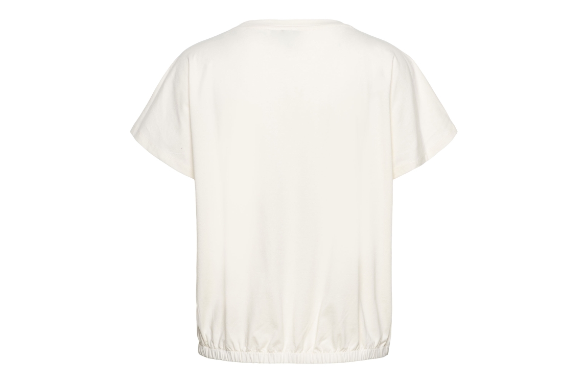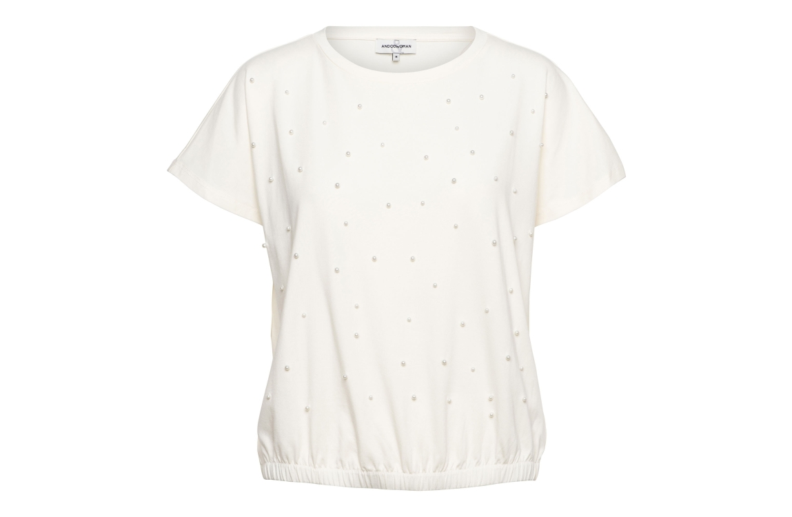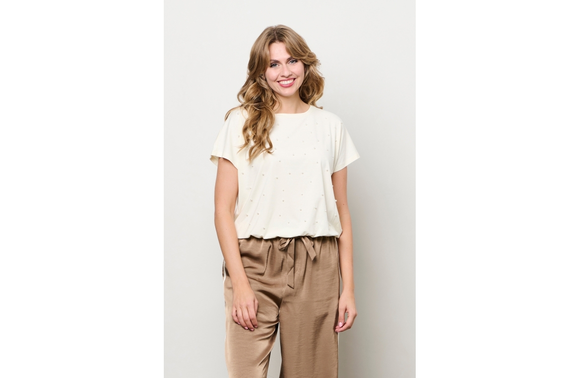 &Co Woman shirt Terese TS141. Dit rechtvallend model is voorzien van een ronde hals en heeft korte mouwen. Deze crèmekleurige shirt van &Co Woman is bewerkt met parels aan de voorzijde en is afgewerkt met een elastische boord.