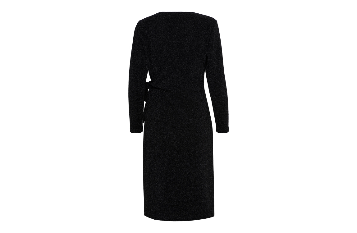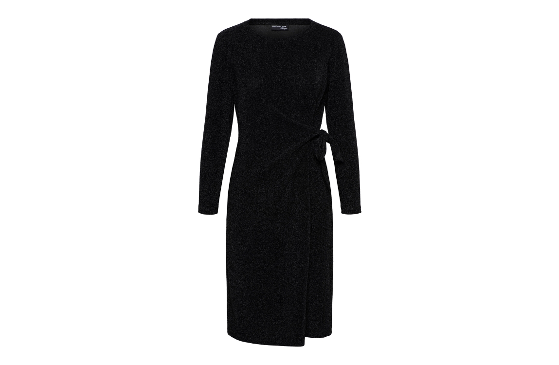 &Co Woman jurk Tokyo DR289. Dit rechtvallende model heeft een ronde halslijn en lange mouwen. Deze zwarte jurk van &Co Woman is all-over bewerkt met glitterdraden en is op de taille voorzien van een strikceintuur. Het model is uitgevoerd in stretchkwaliteit.