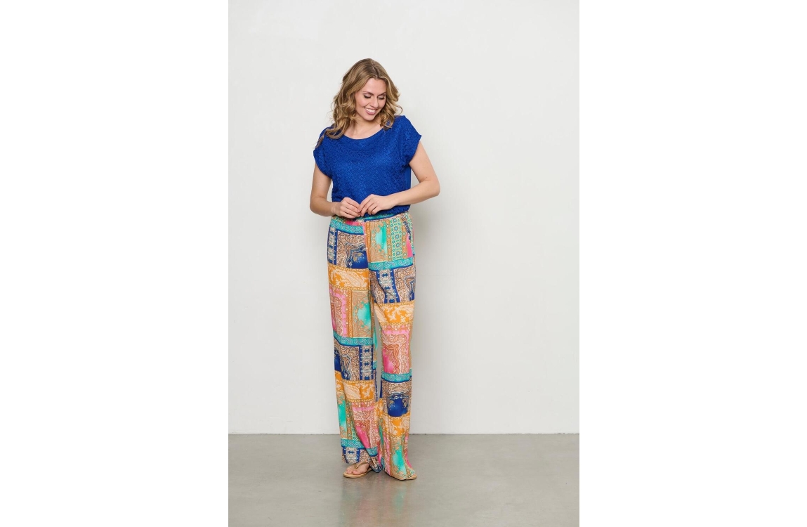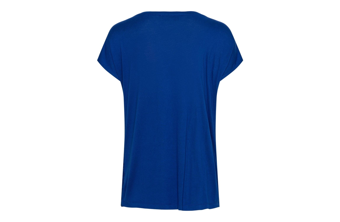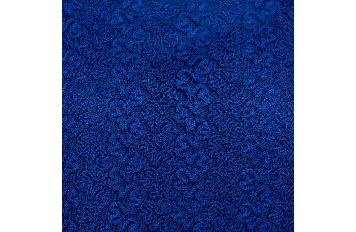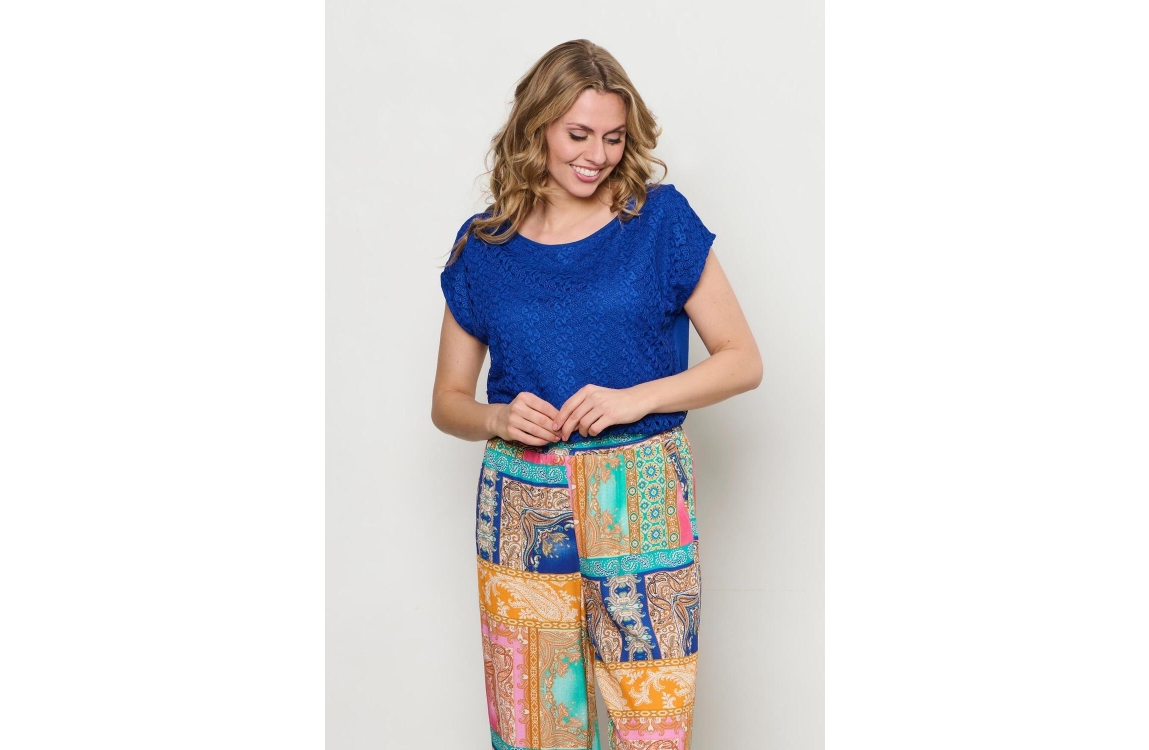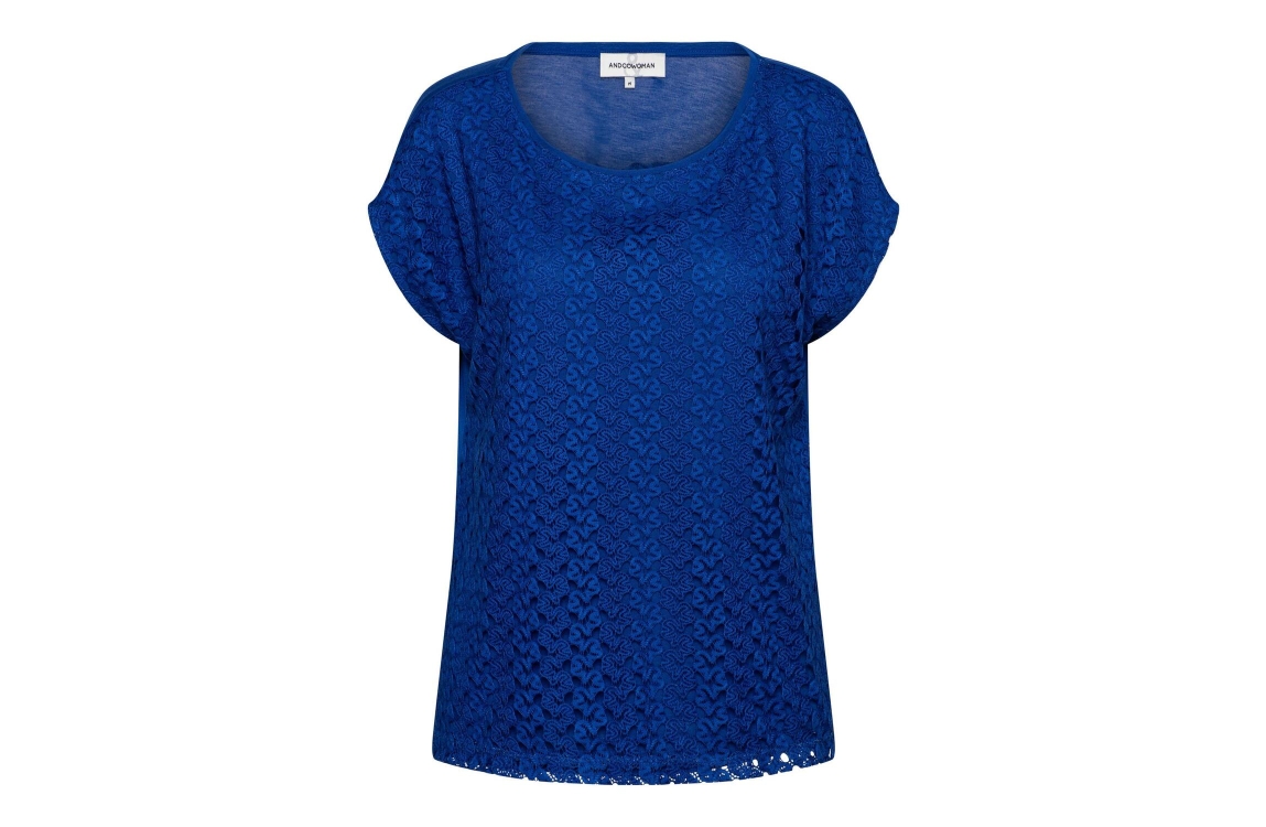 &Co Woman shirt Varena TO307. Dit rechtvallend model is voorzien van een ronde hals en heeft korte mouwen. Deze blauwe shirt van &Co Woman is aan de voorzijde bewerkt met een kanten laag.