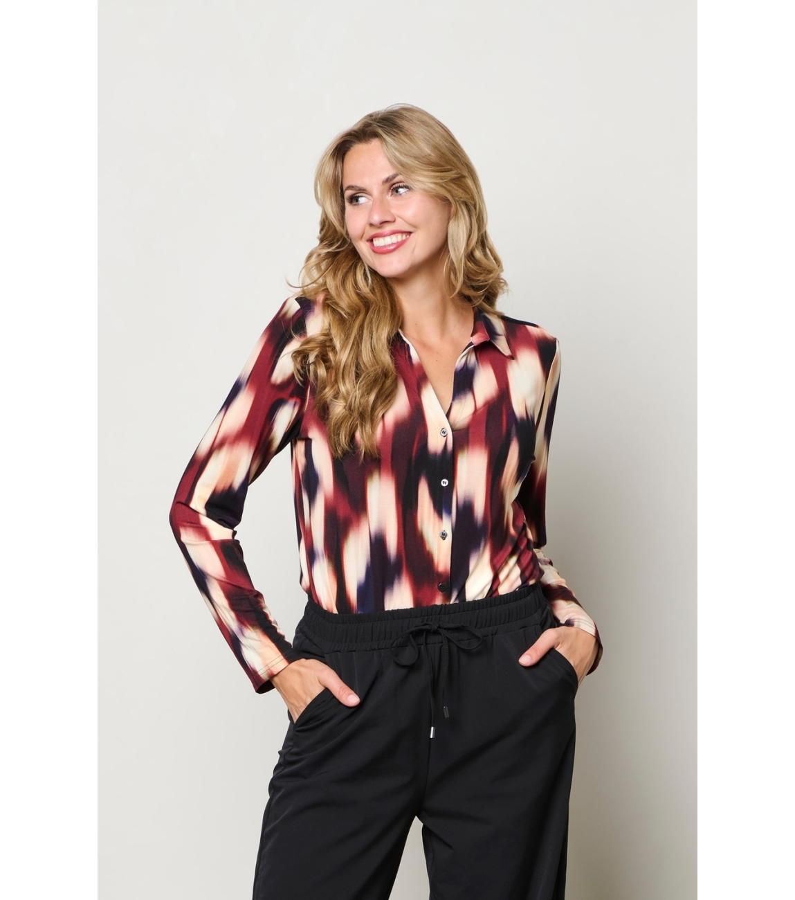 &Co Woman blouse Vayen Faded Big BL402. Dit rechtvallend model is voorzien van een kraag en heeft lange mouwen. Deze rode blouse van &Co Woman sluit door middel van knopen en is all-over bewerkt met verschillende kleuren.