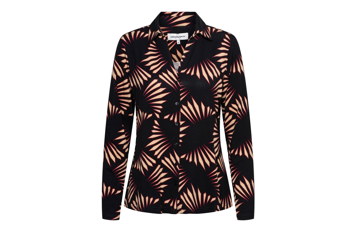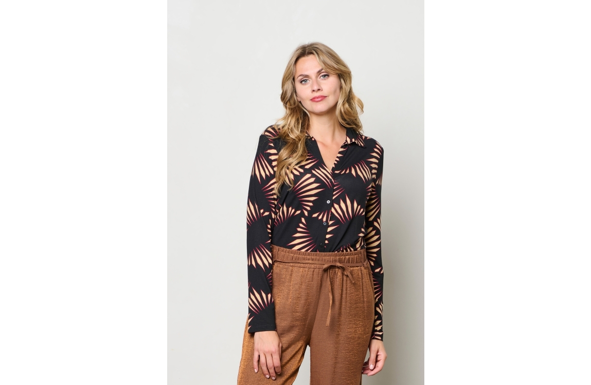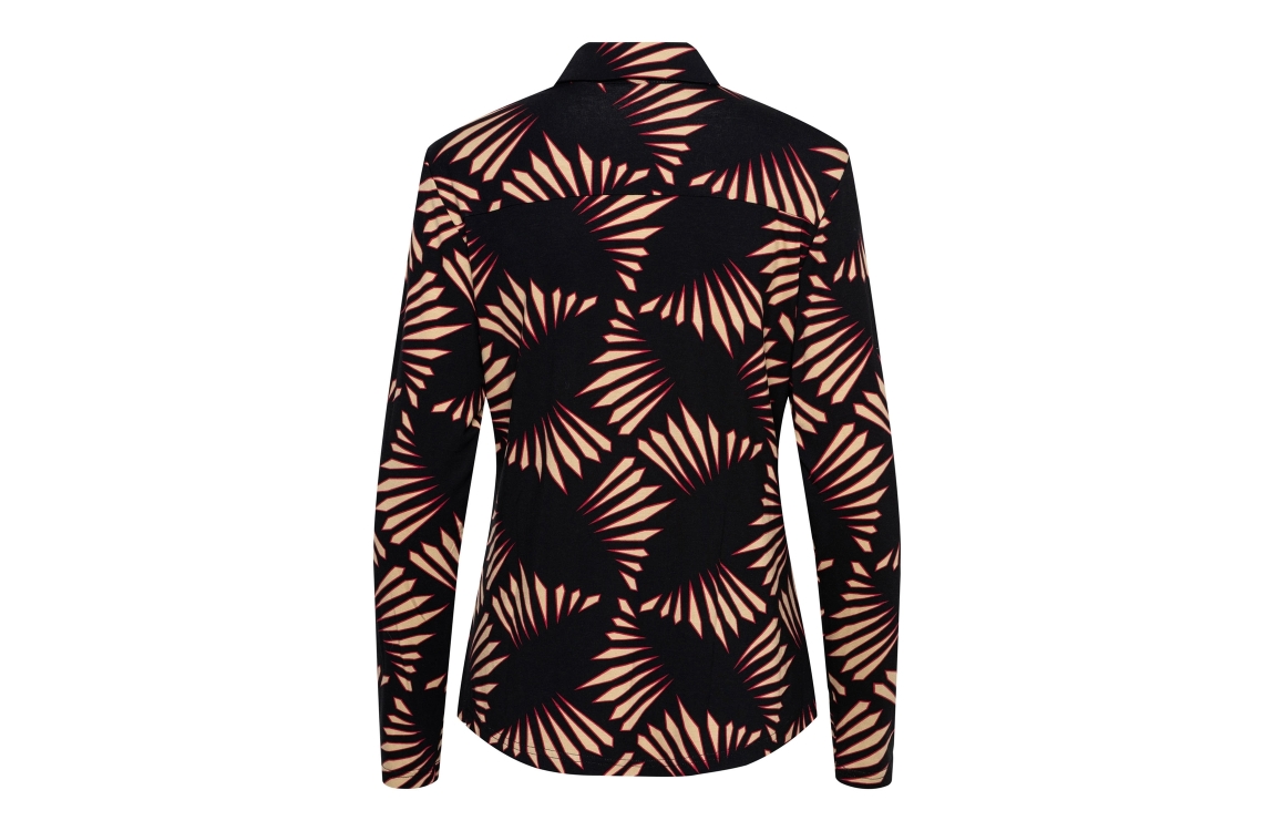&Co Woman blouse Vayen Graphic BL399. Dit rechtvallend model is voorzien van een kraag en heeft lange mouwen. Deze zwarte blouse van &Co Woman sluit door middel van knopen en is all-over bewerkt met beige en rode grafisch design.