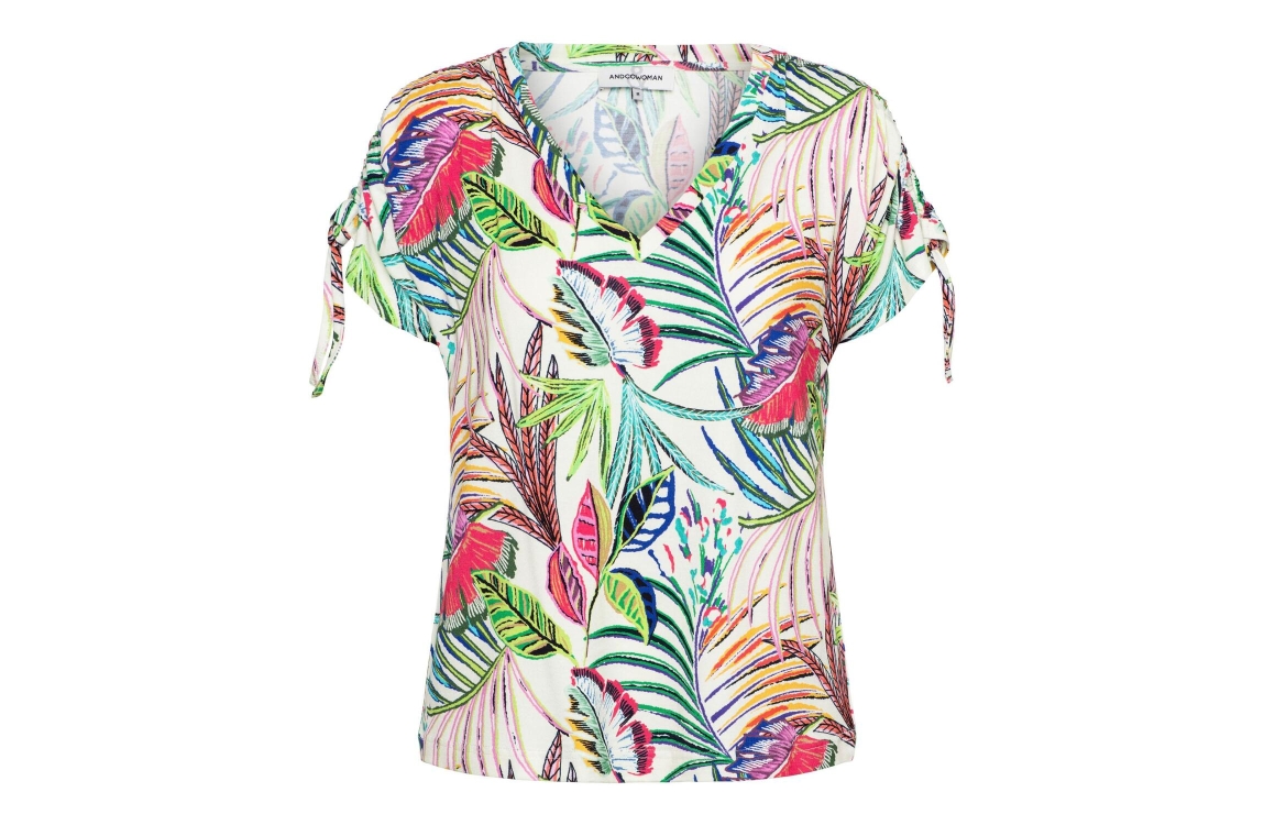 &Co Woman shirt TO303. Dit rechtvallend model heeft een V-hals en korte mouwen met trekkoord. Deze multi-colour shirt van &Co Woman is all-over bewerkt met verschillende 'plant' printen en is uitgevoerd in stretchkwaliteit.