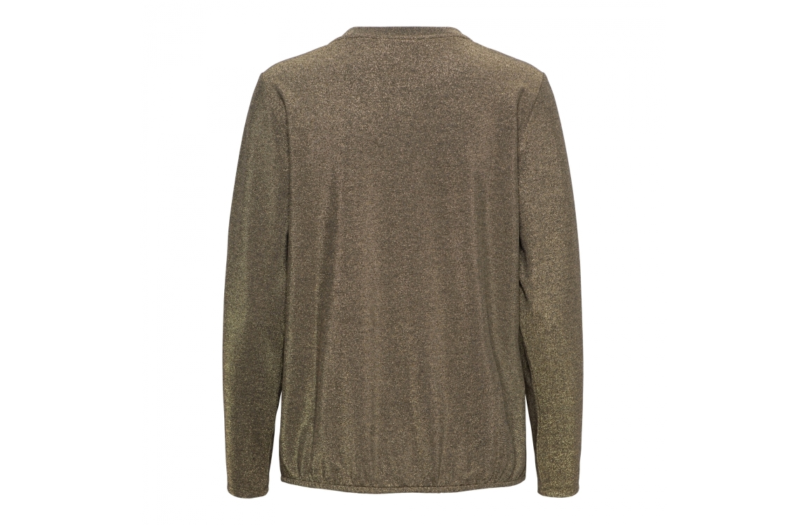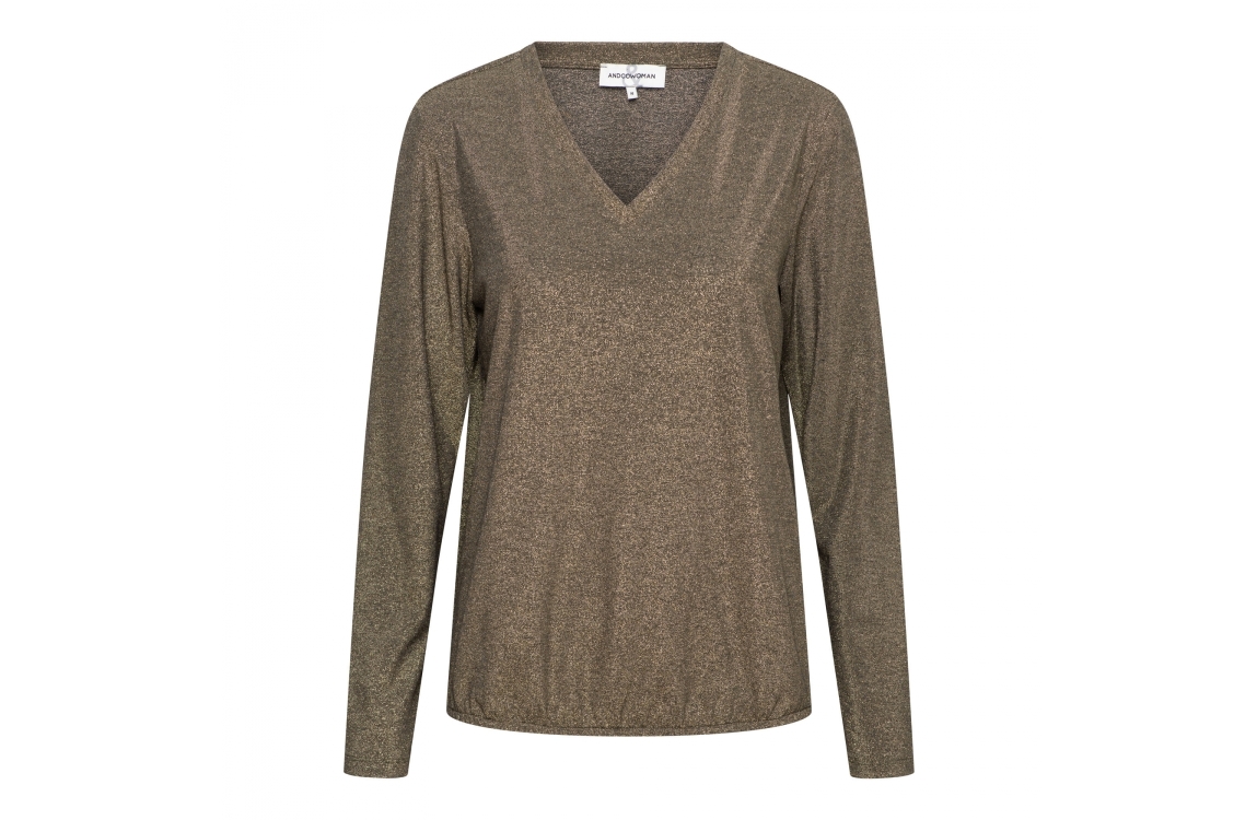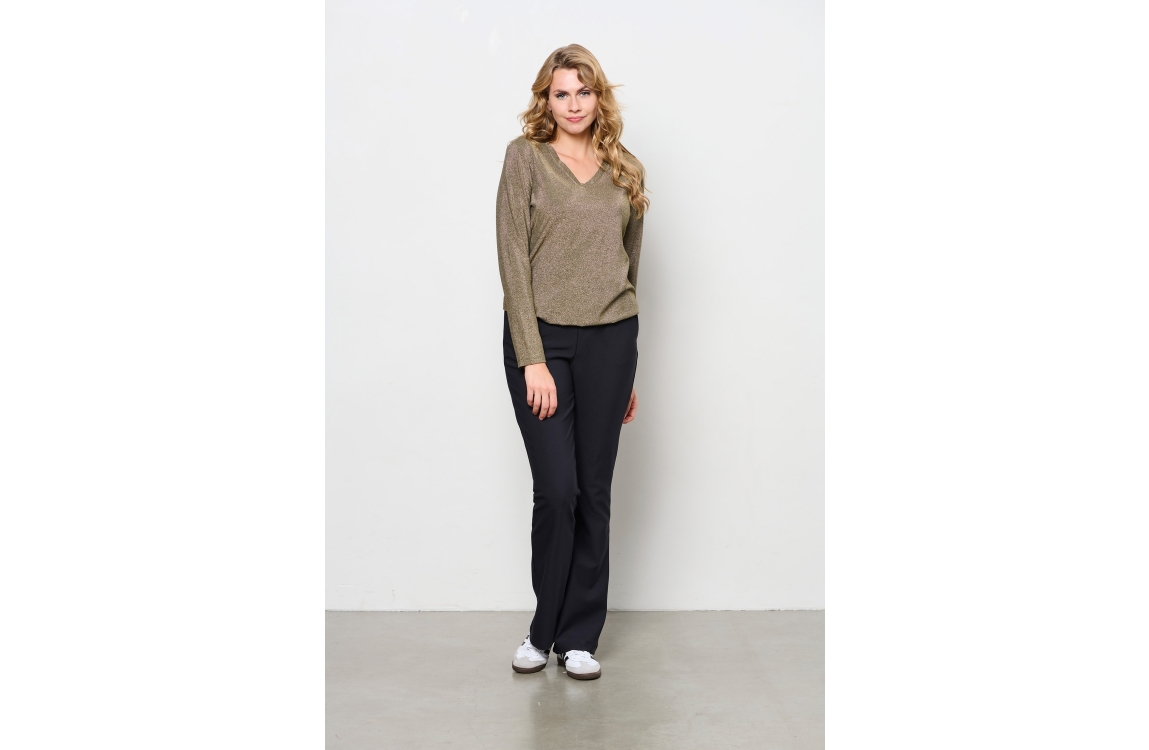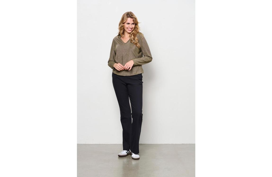 &Co Woman top Vieve ts264. Dit rechtvallend model is voorzien van een v-hals en heeft lange mouwen. Deze goudkleurige top van &Co Woman is bewerkt met een glitter.