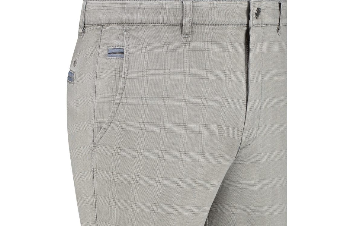 Com4 broek 21202028. Dit rechtvallend model is voorzien van twee steekzakken aan de voorzijde en twee steekzakken aan de achterzijde die sluit door middel van een knoop. Deze grijze chino van Com4 heeft een all-over geruite print.