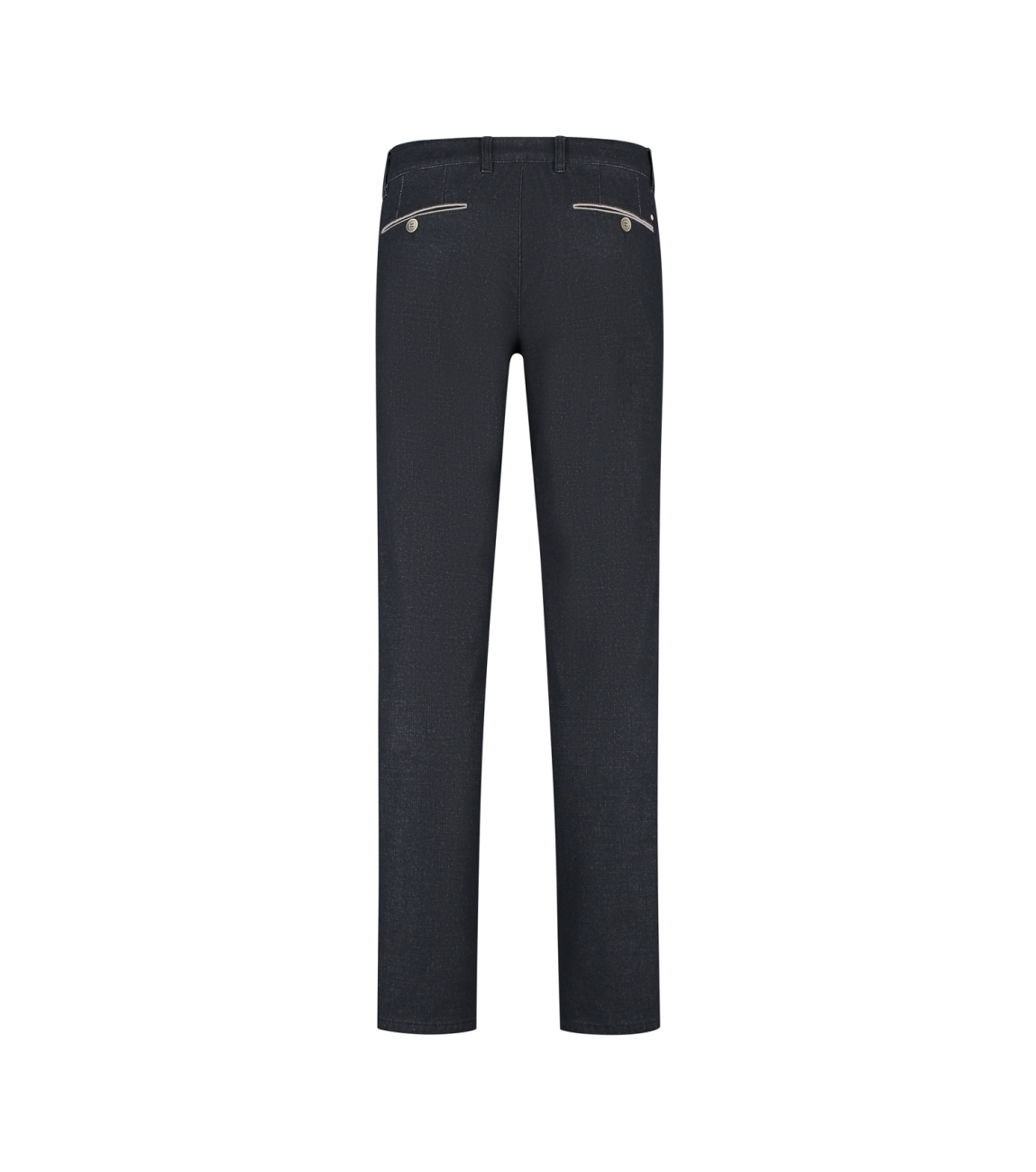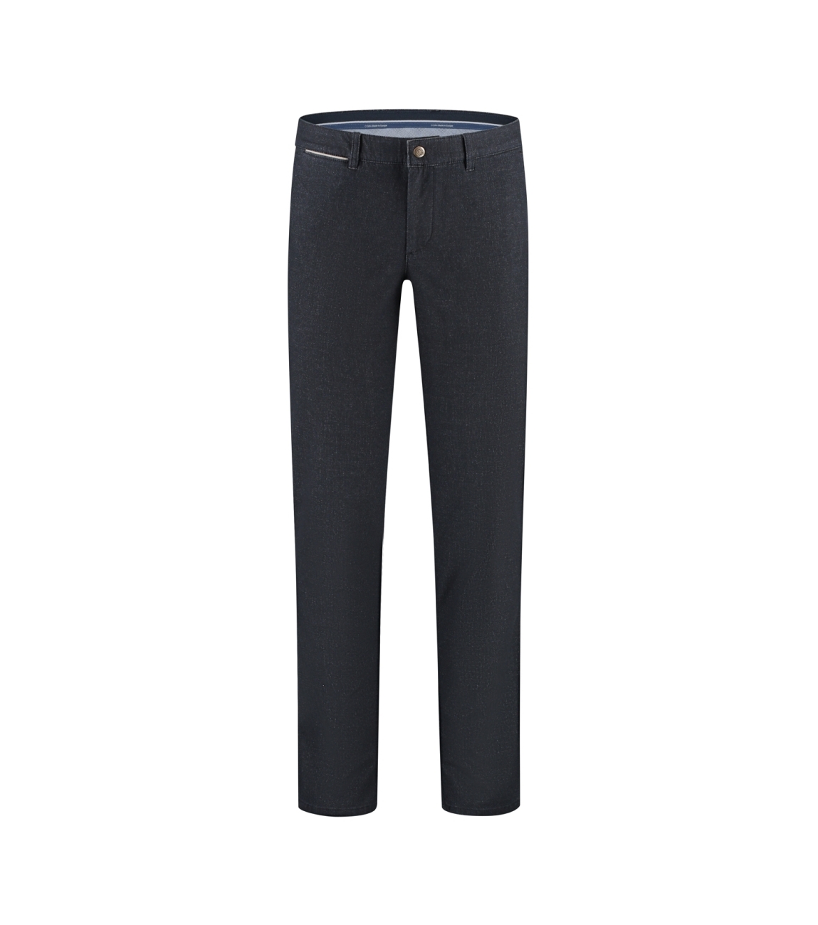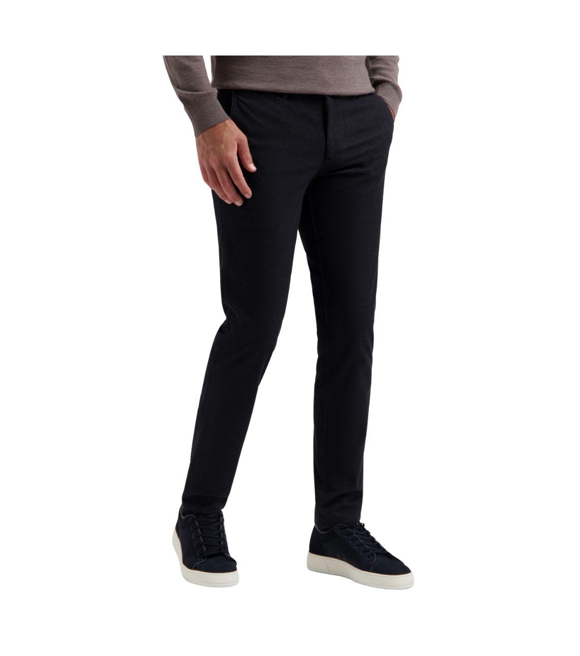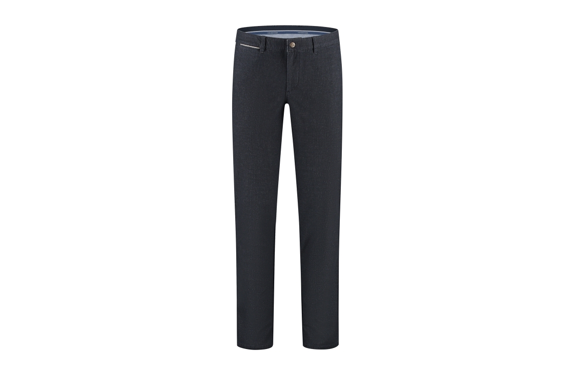 Com4 broek Modern Chino 21282114 412. Dit regular fit model sluit door middel van een knoop- en ritssluiting en is voorzien van ceintuurlussen. Deze donkerblauwe broek van Com4 is voorzien van twee gedetailleerde steekzakken aan de voorzijde en twee paspelzakken aan de achterzijde.