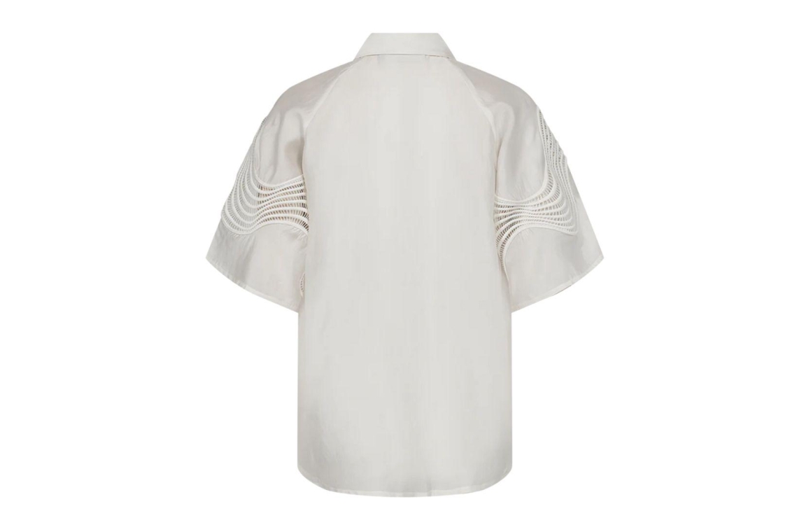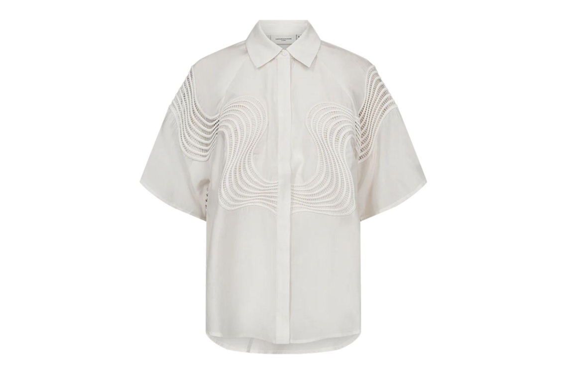 Copenhagen Muse blouse CMMOLLY 206243. Dit rechtvallend model is voorzien van een kraag en heeft korte mouwen. Deze witte blouse van Copenhagen Muse sluit door middel van knopen en is bewerkt met opengewerkte details.