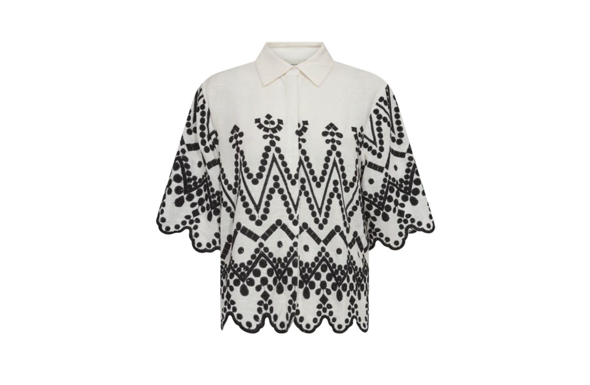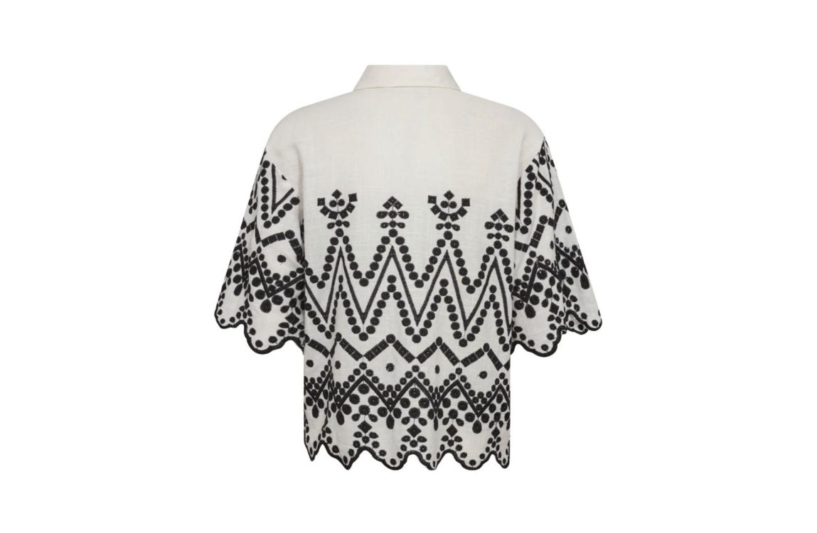 Copenhagen Muse shirt 206381. Dit rechtvallend model is voorzien van een kraag en heeft driekwart mouwen. Deze witte shirt van Copenhagen Muse sluit door middel van knopen en is gedeeltelijk bewerkt met zwarte broderie.