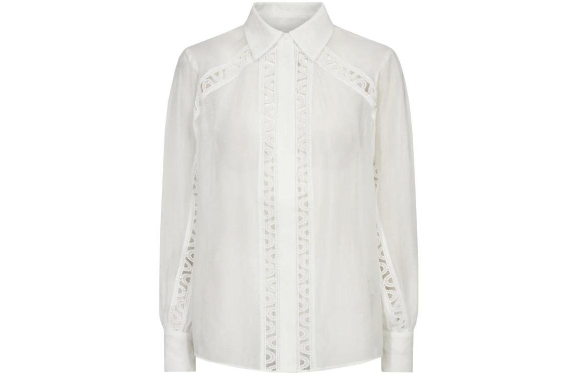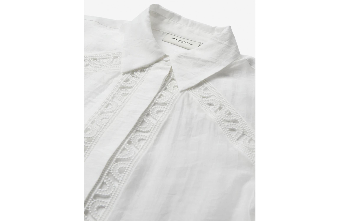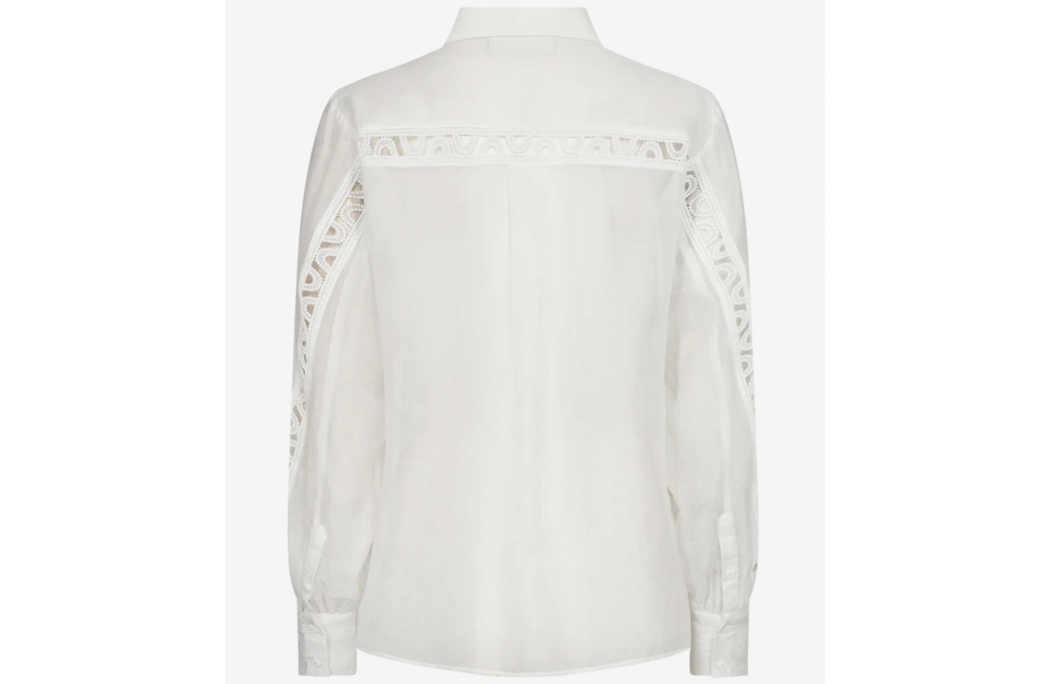 Copenhagen Muse blouse CMultra. Dit elegante model is voorzien van een kraag en heeft lange mouwen. Deze witte blouse van Copenhagen Muse sluit door middel van knopen en afgewerkt met opengewerkte kanten details. Deze blouse is semi-transparant.