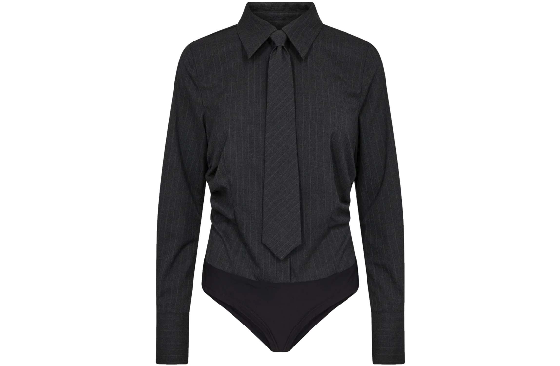 Copenhagen Muse body CMTiedy 204958. Dit slim fit model is voorzien van een kraag en heeft lange mouwen. Deze grijze pintstripe body sluit door middel van knopen en beschikt over een afneembare stropdas.