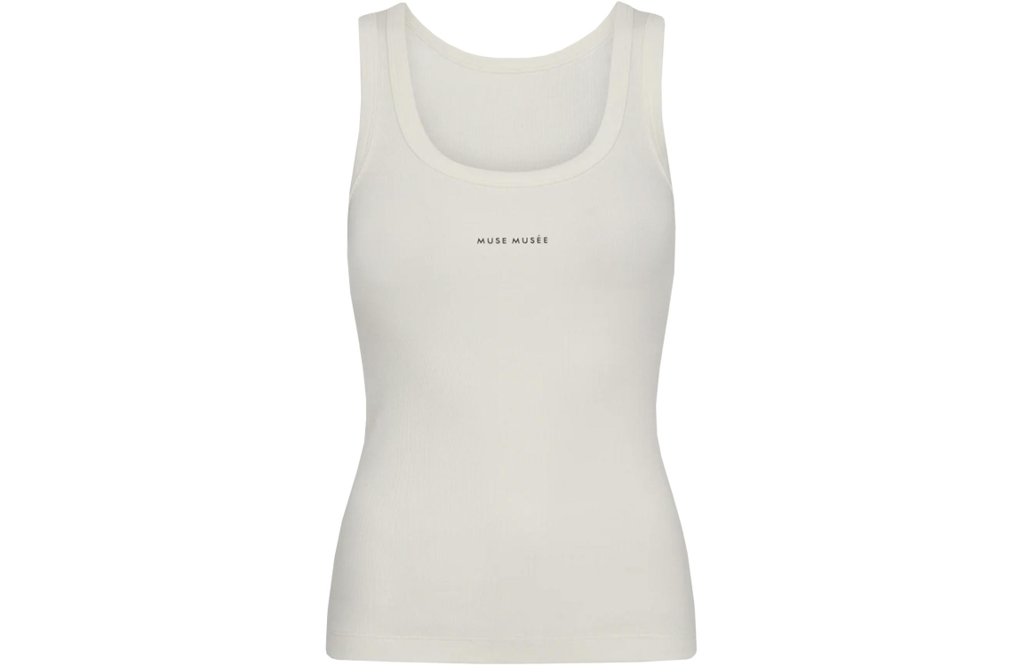 Copenhagen Muse top siv 203619. Dit aangesloten model is voorzien van een ronde hals en is mouwloos. Deze wit geribde top van Copenhagen Muse is aan de voorzijde bewerkt met "Muse Musée".