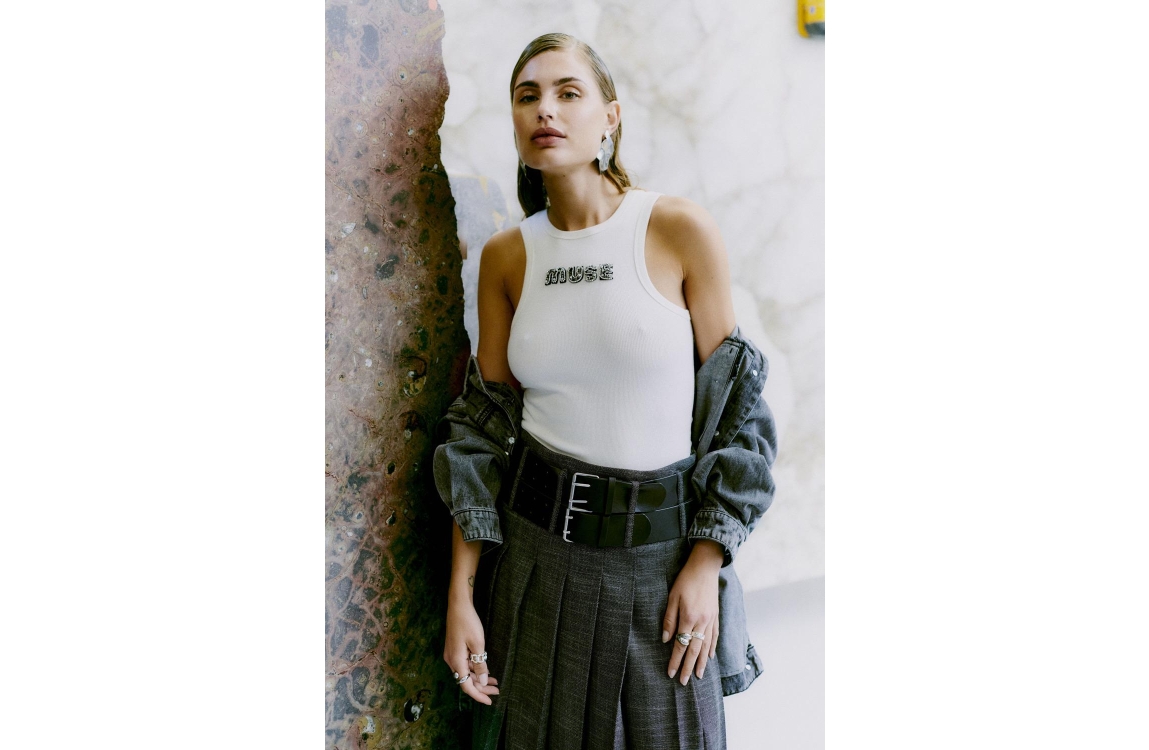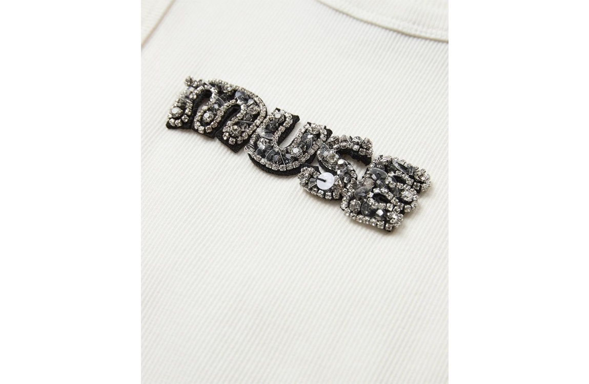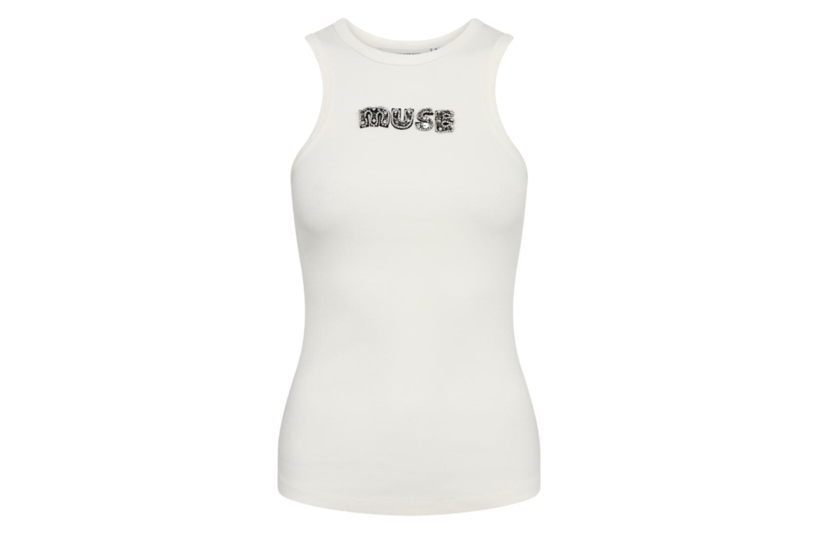 Copenhagen Muse top 205261. Dit aangesloten model heeft een turtle neck en is mouwloos. Deze off-white kleurige top van Copenhagen Muse is bewerkt met een glitter borduursel op het voorpand.