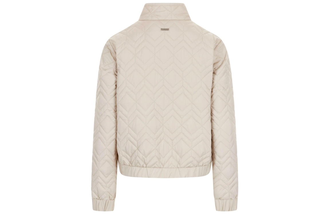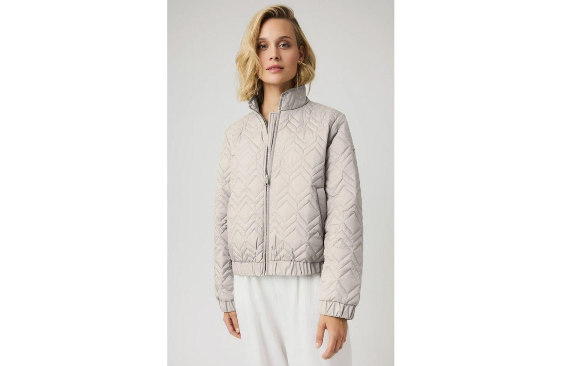 Covered jacket Gina L60448CO05. Dit korte stoere model is voorzien van een ronde hals en heeft lange mouwen. Deze beige jas van Covered sluit door middel van een rits en beschikt over twee ritszakken. Dit model is gewatteerd uitgevoerd in een ruit structuur.