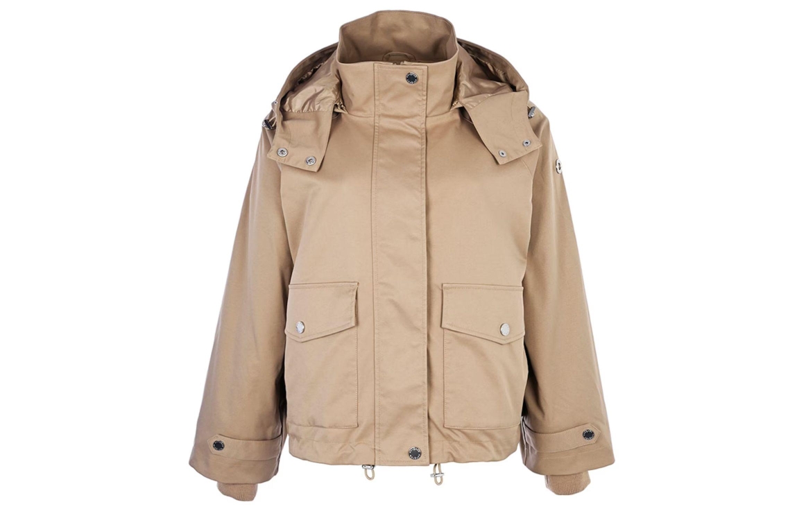 Covered Jacket MALU 0525 Smoke beige. Dit rechtvallende model heeft een opstaande kraag met capuchon en lange mouwen. Deze beige jas van Covered sluit door middel van knopen met ritssluiting en is voorzien van klepzakken aan de voorzijde.