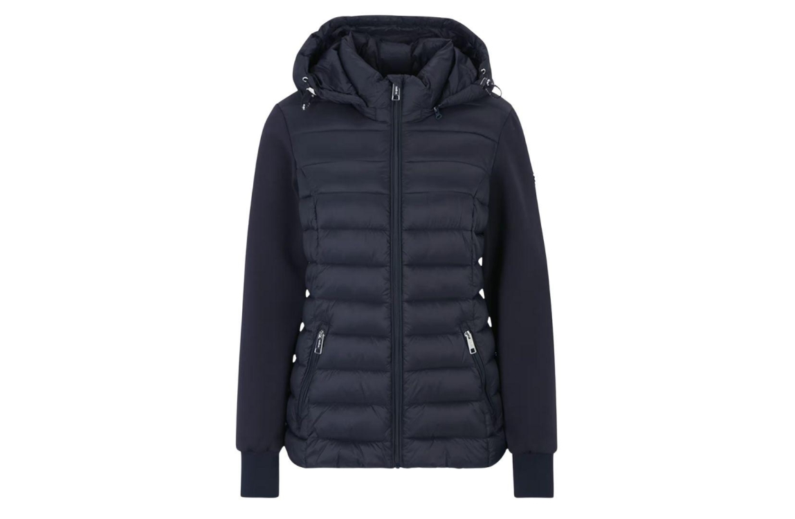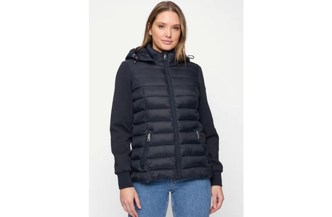 Covered jacket Sophia L60366CO18. Dit rechtvallend model is voorzien van een afneembare capuchon met trekkoorden en heeft lange mouwen. Deze donkerblauwe jas van Covered sluit door middel van een rits en beschikt over twee ritszakken. Dit model is bij de romp gewatteerd uitgevoerd.