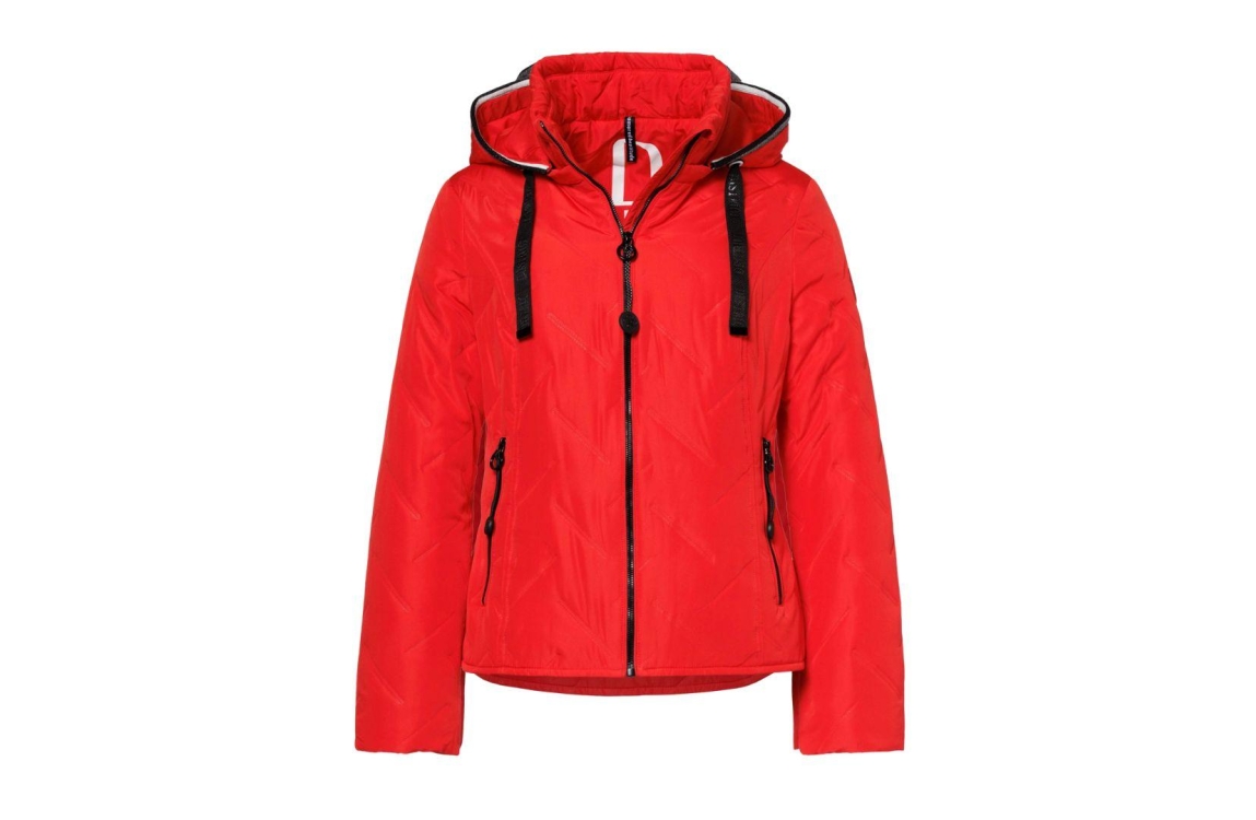 District jas Bluebell 3050 red. Dit rechtvallend model is voorzien van een afneembaar capuchon met trekkoorden en heeft lange mouwen. Deze rode jas van District sluit door middel van een rits en beschikt over twee ritszakken. Dit model is bewerkt met het merkembleem op de schouder.