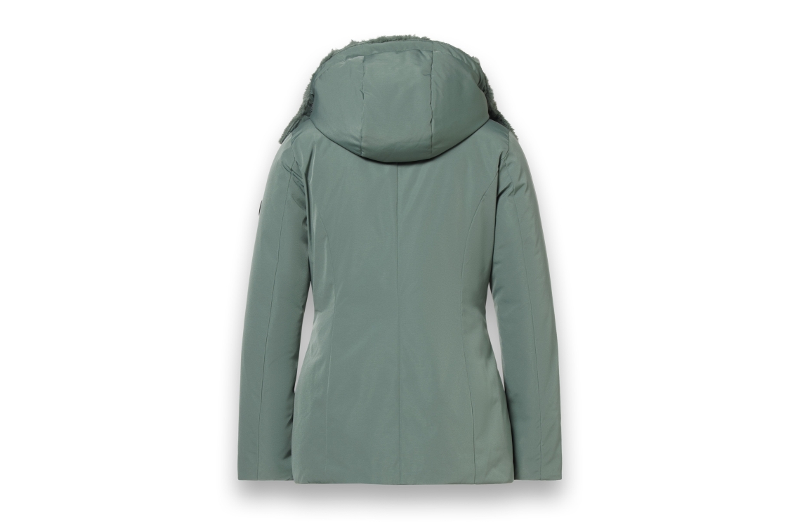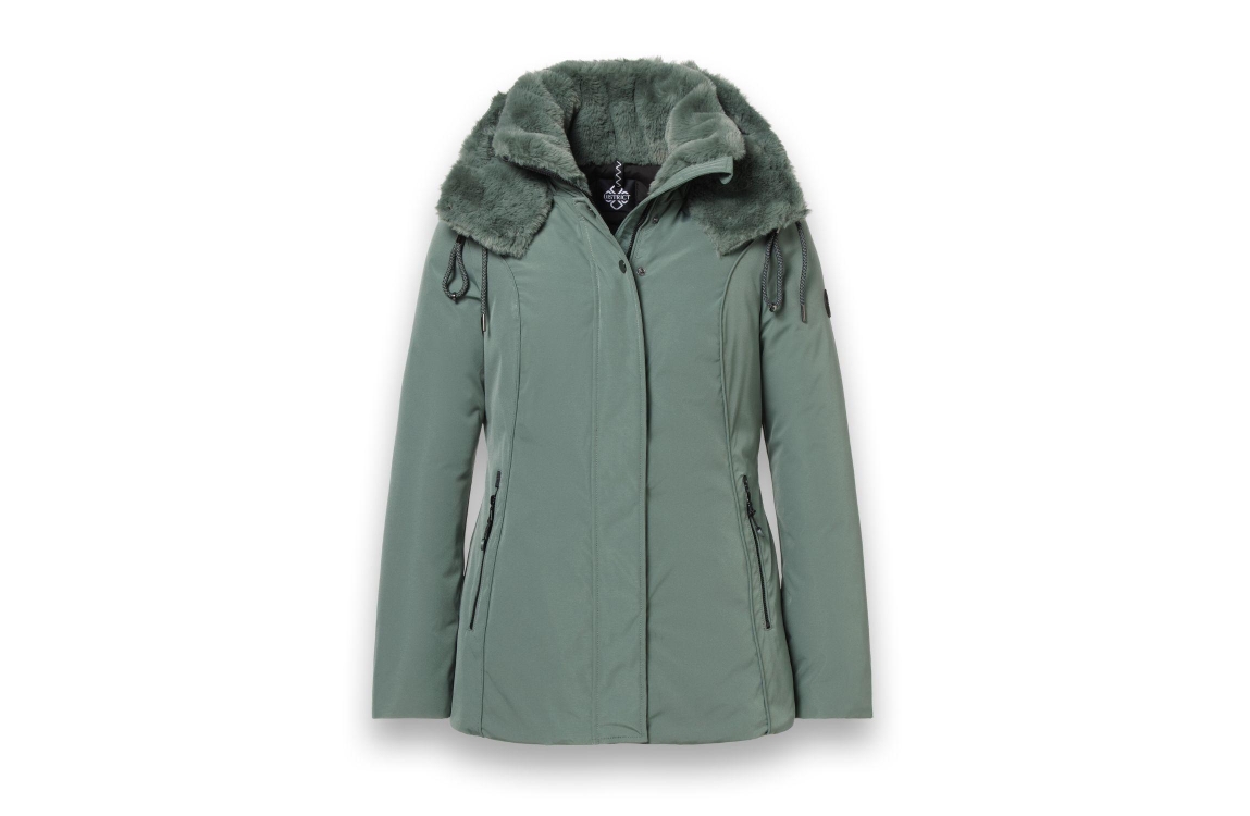 District ECLIPSE 616 green tea. Deze middellange jas heeft een afneembare capuchon, lange mouwen en sluit door middel van een rits. Deze groene jas van District is voorzien van twee ritszakken die sluiten door middel van een rits. Dit model heeft een een kraag met imitatiebont voering.