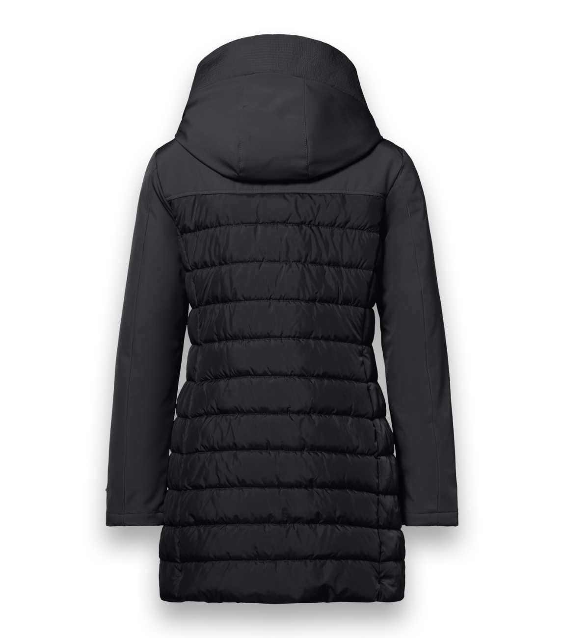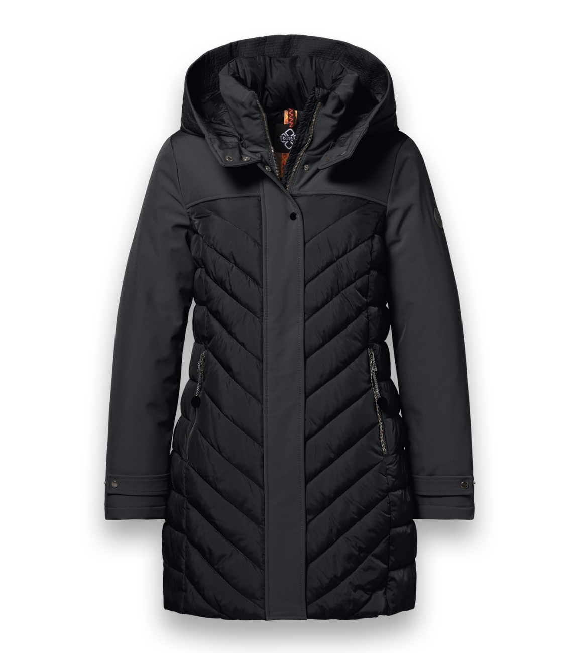 District ST MORITZ winterjas LM27120253/777. Dit rechtvallende model heeft een capuchon en lange mouwen. Deze zwarte winterjas van District sluit door middel van een rits en is voorzien van verschillende jaszakken.