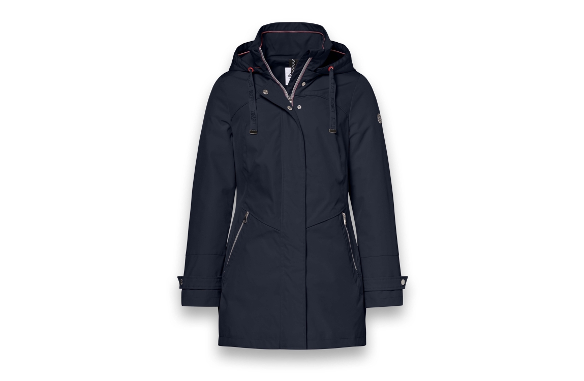 District jas Waterlily LM10620261/777 Dit rechtvallende model heeft een opstaande kraag met afneembare capuchon en lange mouwen. Deze donkerblauwe jas van District sluit aan de voorzijde door middel van knopen en een rits en is voorzien van twee ritszakken. Het model is afgewerkt met een trekkoord in de capuchon en gespdetails op de rug en mouwboorden.