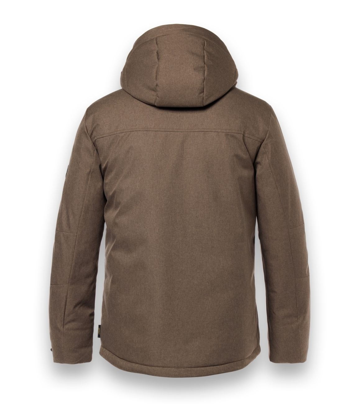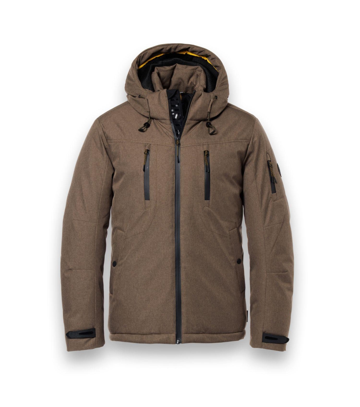 District WEDGE 211 walnut. Dit rechtvallende model is voorzien van een opstaande kraag met capuchon en sluit doormiddel van een rits. Deze bruine jas van District heeft aan de voorzijde twee ritszakken, twee steekzakken en een mouwzak. Dit model heeft een binnenzak.