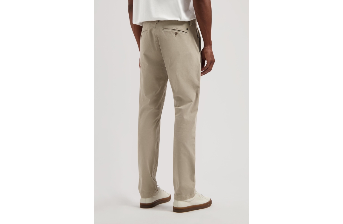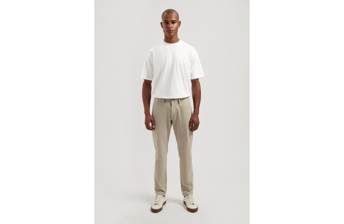 Dstrezzed Marlon Dynamic Twill broek 501958. Dit rechtvallende model sluit door middel van een knoop, rits en een elastische boord aan de achterzijde. Deze beige broek van Dstrezzed is voorzien van verschillende steekzakken en riemlusjes.
