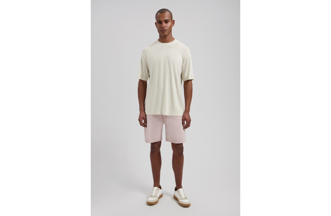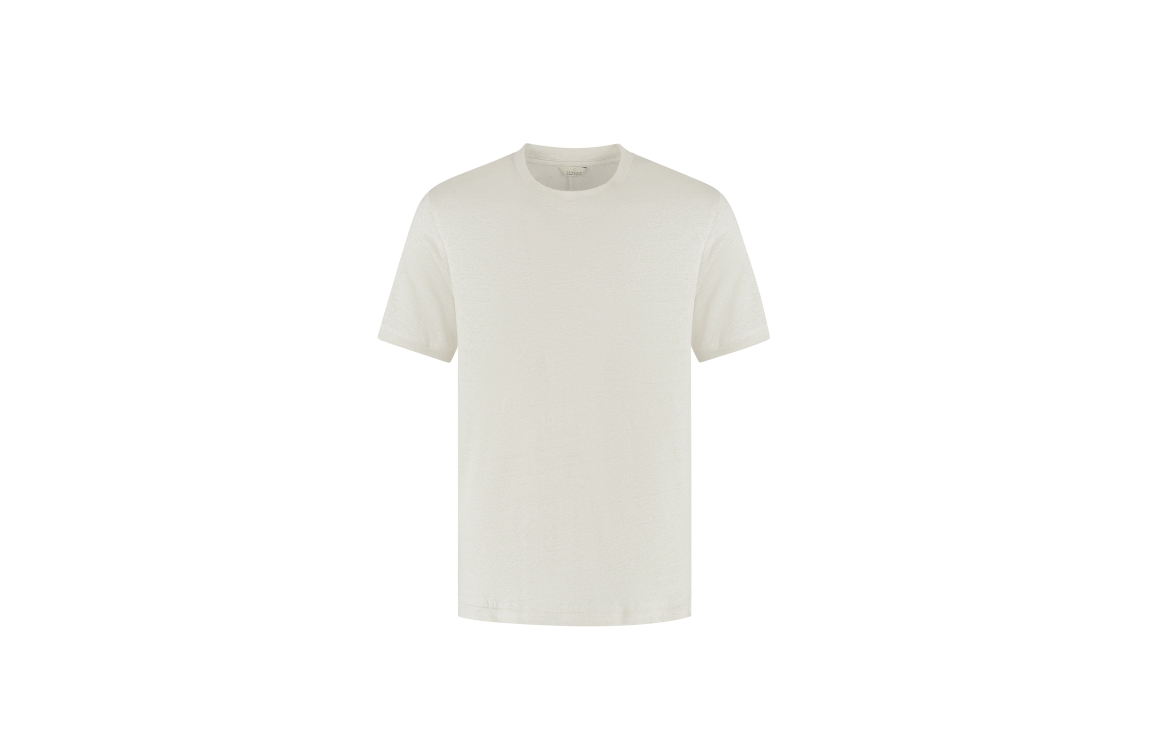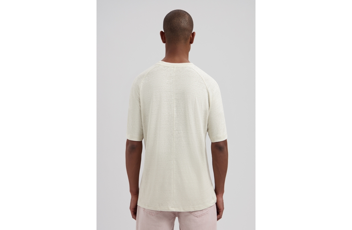 Dstrezzed Romain T-shirt 203530. Dit wide fit model heeft een ronde hals en korte mouwen. Dit off-white T-shirt van Dstrezzed is uitgevoerd in een semi-transparant linen materiaal en bevat stretch.