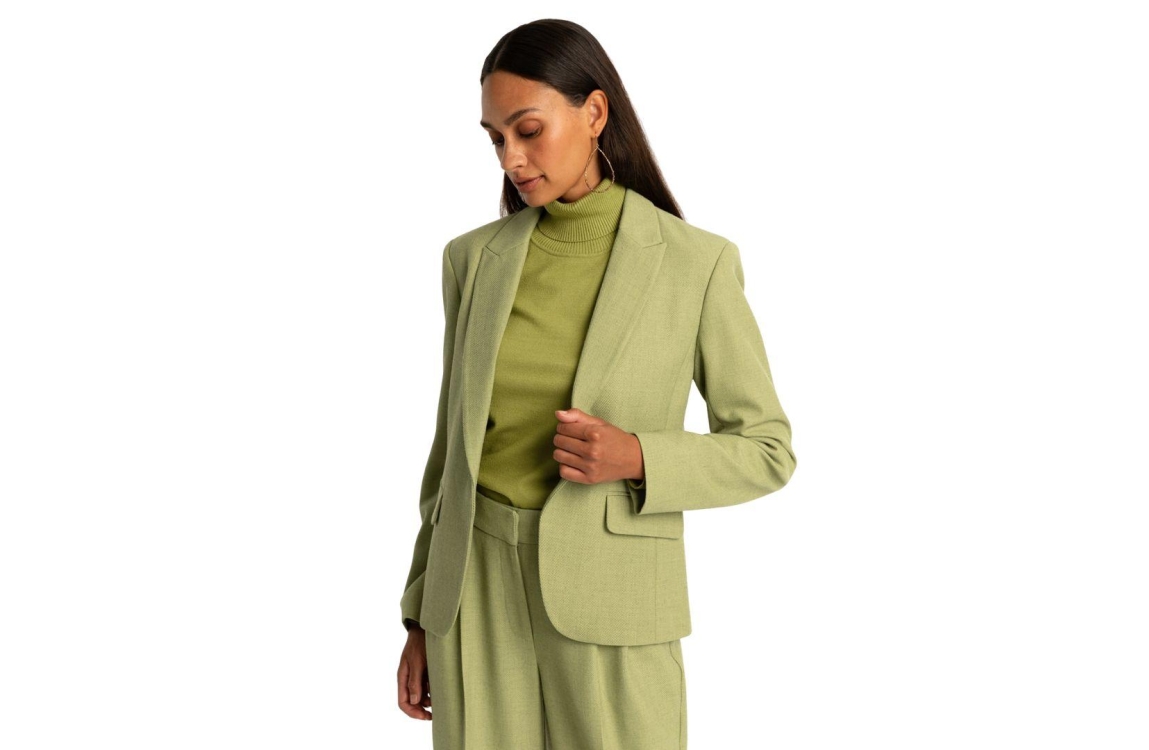 Expresso blazer EX15-251152. Dit licht getailleerde is voorzien van een reverskraag en heeft lange mouwen. Deze groene geweven blazer van Expresso sluit door middel van knopen en beschikt over twee klepzakken.