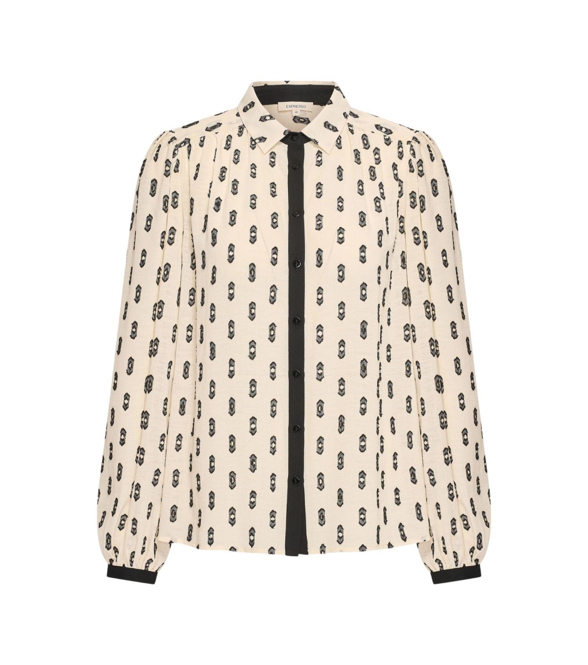 Expresso Blouse woven jacquard chiffon EX200 Off white. Dit rechtvallende model heeft een kraag, lange mouwen en sluit door middel van knopen. Deze off-white blouse van Expresso is bewerkt met een grafische print. Dit model heeft een licht transparante stof en subtiel geplooide schouders.