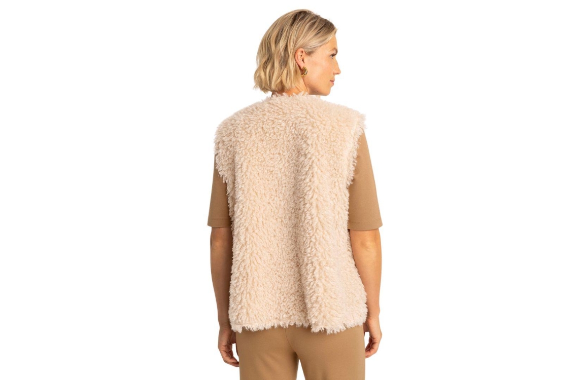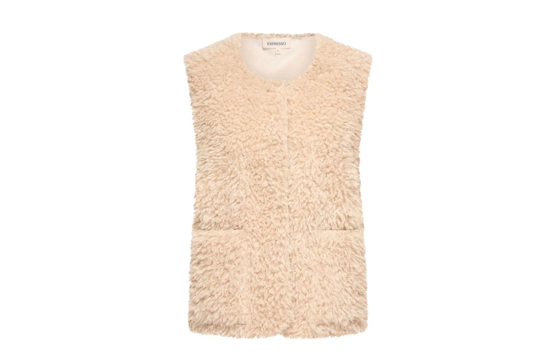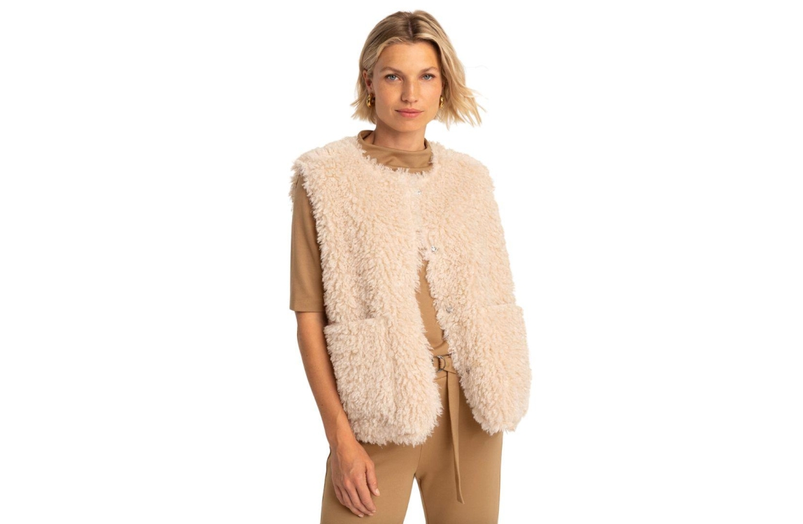 Expresso bodywarmer EX16-25827. Dit rechtvallend model is voorzien van een ronde hals en is mouwloos. Deze beige teddy gilet sluit door middel van knopen en beschikt over twee zakken.
