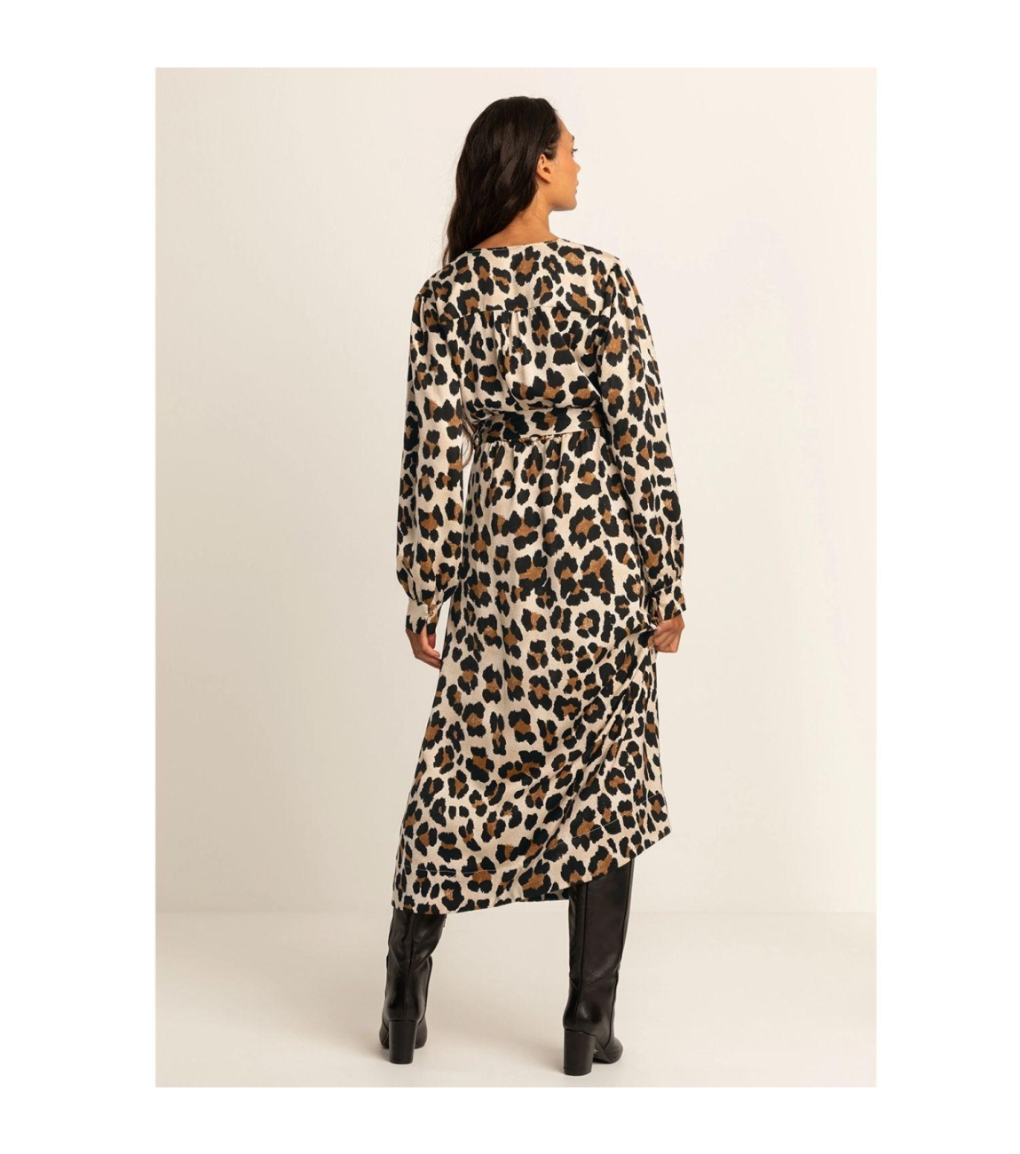 Expresso Dress woven satin print EX122 Coconut. Dit rechtvallende model is voorzien van een v-hals en heeft lange mouwen met manchetten. Deze beige luipaardprint jurk van Expresso sluit aan de bovenzijde door middel van knopen. Dit model heeft een afneembaar strikceintuur en de lengte van de jurk komt tot halverwege de kuit.