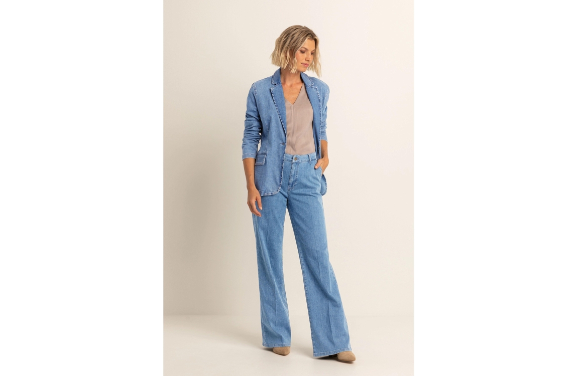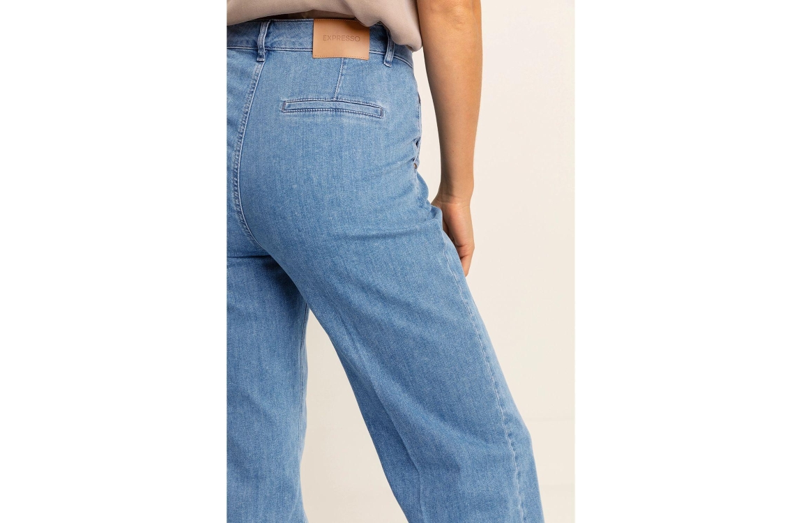 Expresso Pants mid blue denim wide leg EX350 Mid blue denim. Dit rechtvallende model met een licht uitlopende pijp sluit door middel van een knoop en ritsaansluiting en heeft ceintuurlussen. Deze jeans van Expresso beschikt over twee steekzakken aan de voorzijde en twee paspelzakken aan de achterzijde.