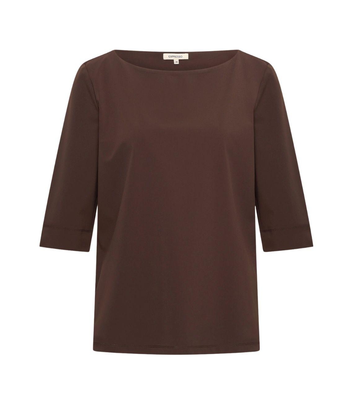 Expresso shirt EX13-25786 EX101. Dit rechtvallende model heeft een wijde halslijn en driekwart mouwen. Deze donkerbruine shirt van Expresso is uitgevoerd in stretchkwaliteit.