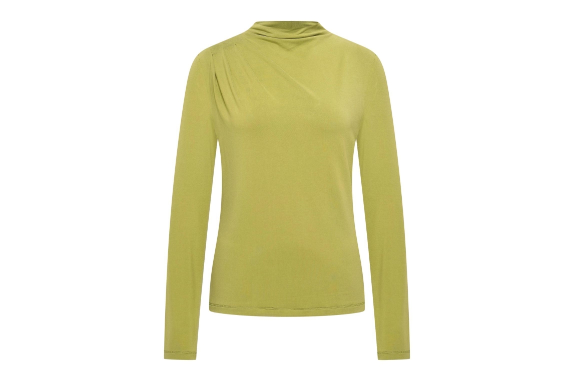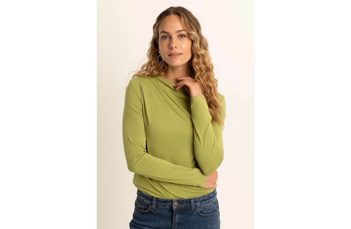 Expresso Tee shoulder pleat EX512 Laurel. Dit rechtvallende model heeft een ronde hoge hals en lange mouwen. Deze groene top van Expresso is afgewerkt met geplooide details op de schouder en ribboorden.
