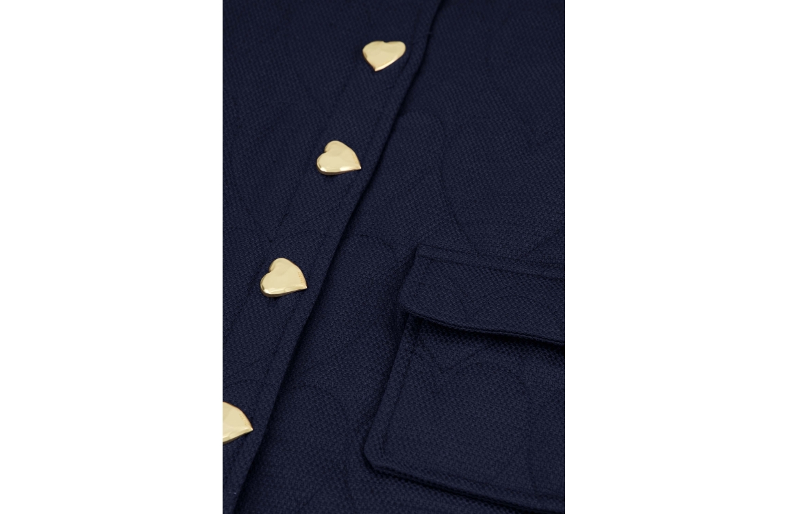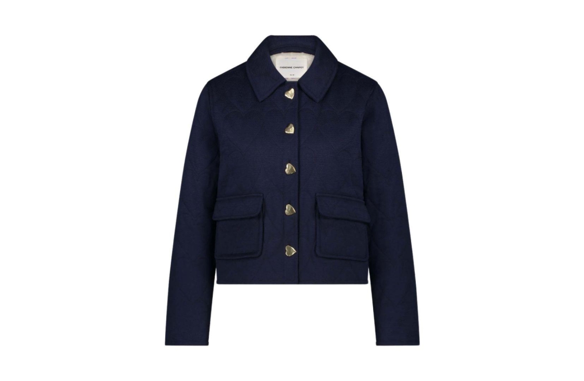 Fabienne Chapot jackie jasje cltjkt06ss253624. Dit rechtvallend model is voorzien van een kraag en heeft lange mouwen. Deze donkerblauwe jasje van Fabienne Chapot sluit door middel van goudkleurige hartjes knopen en beschikt over twee klepzakken. Dit model is gewatteerd uitgevoerd all-over bewerkt met hartvormen.
