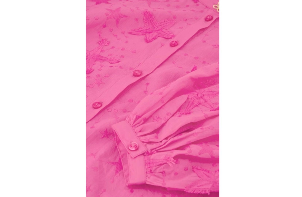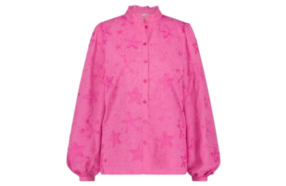 Fabienne Chapot Blouse Jonny clt-56. Dit rechtvallend model is voorzien van een ronde hals met ruffles en ballon mouwen. Deze roze blouse van Fabienne Chapot is all over bewerkt met een grafische print van geborduurde sterren. De blouse sluit door middel van knopen en heeft bij de bovenste knoop een gouden bloemetjes detail.