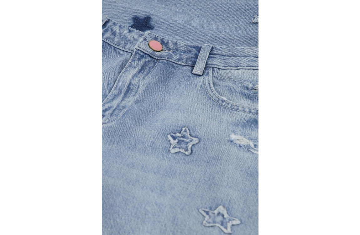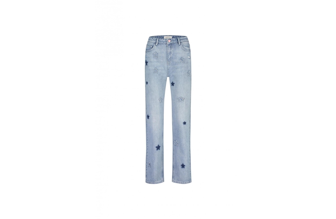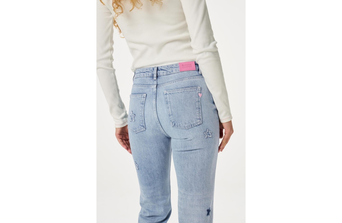 Fabienne Chapot Lola jeans. Dit rechtvallende model sluit door middel van een knoop en een rits. Deze blauwe denim jeans van Fabienne Chapot is voorzien van riemlusjes en steekzakken en all-over voorzien van sterren.