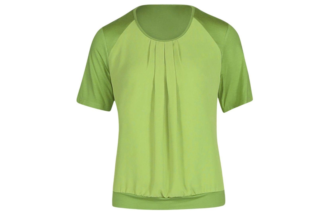Frank Walder blouse NOS714404 703. Dit rechtvallende model heeft een ronde halslijn en korte mouwen. Deze groene blouse van Frank Walder is gedetailleerd met plooien op de hals en heeft afgewerkte boorden.
