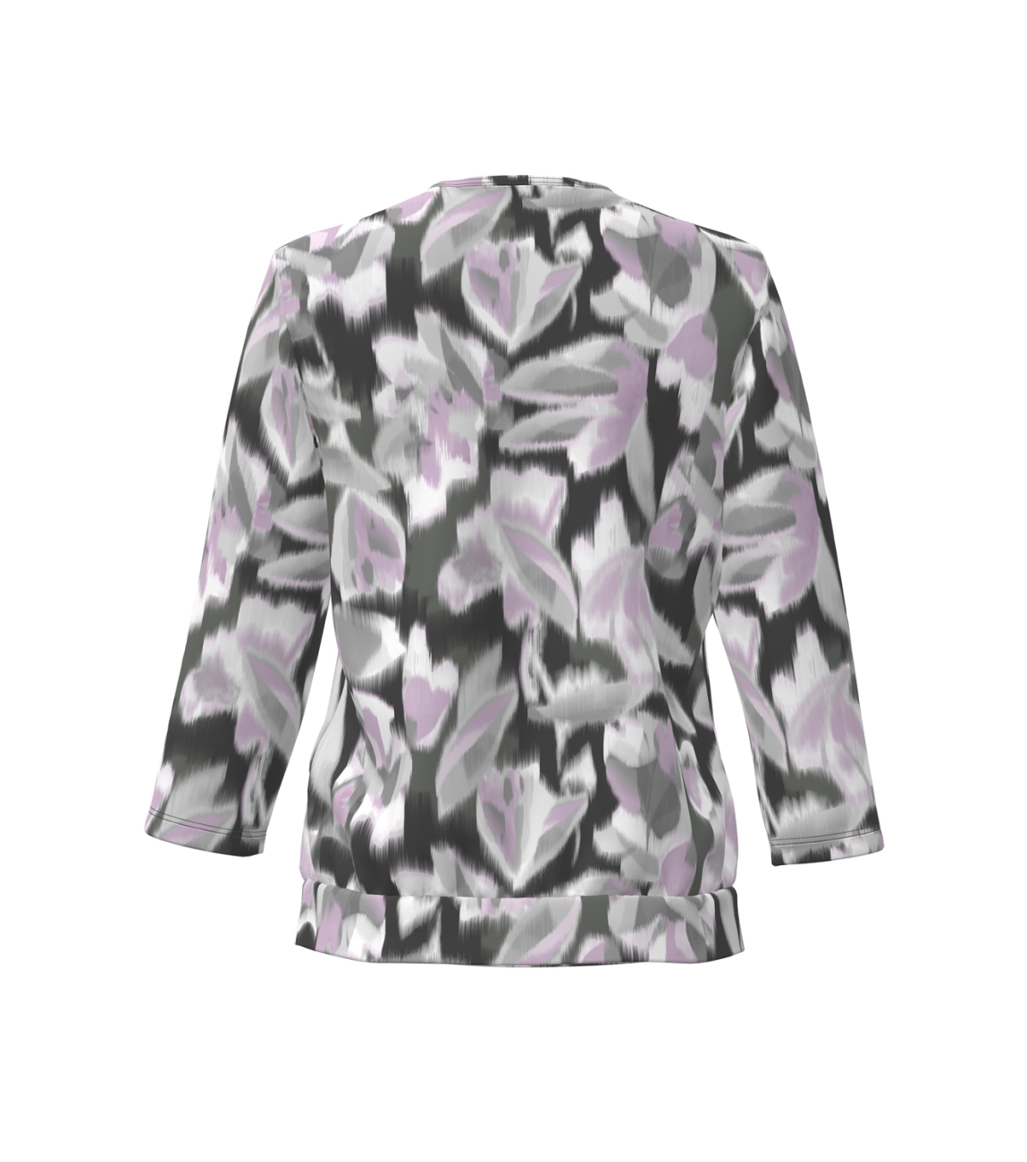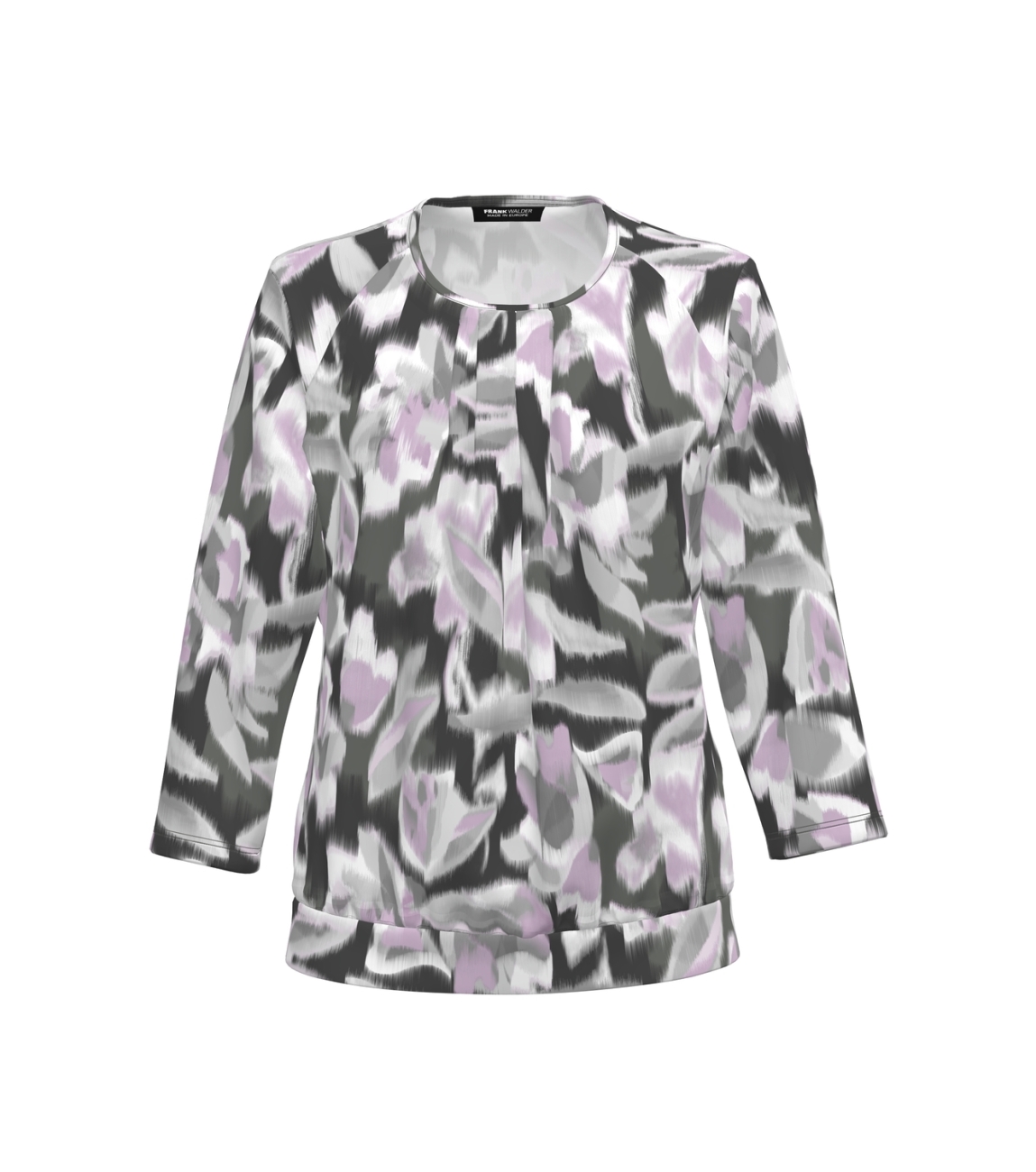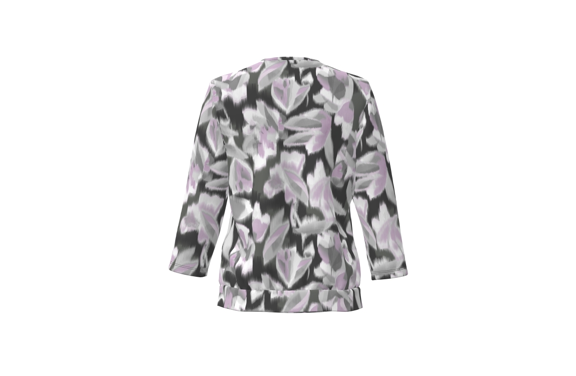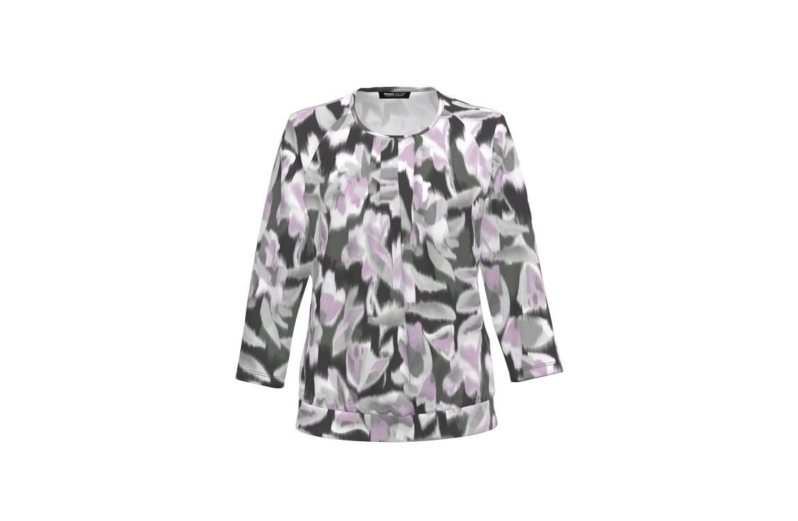 Frank Walder blouson 725/423/01134. Dit soepelvallende model is voorzien van een ronde hals en heeft driekwart mouwen. Deze lila/grijze blouson van Frank Walder is bewerkt met een all over grafische print en voorzien van een boord aan de onderzijde.