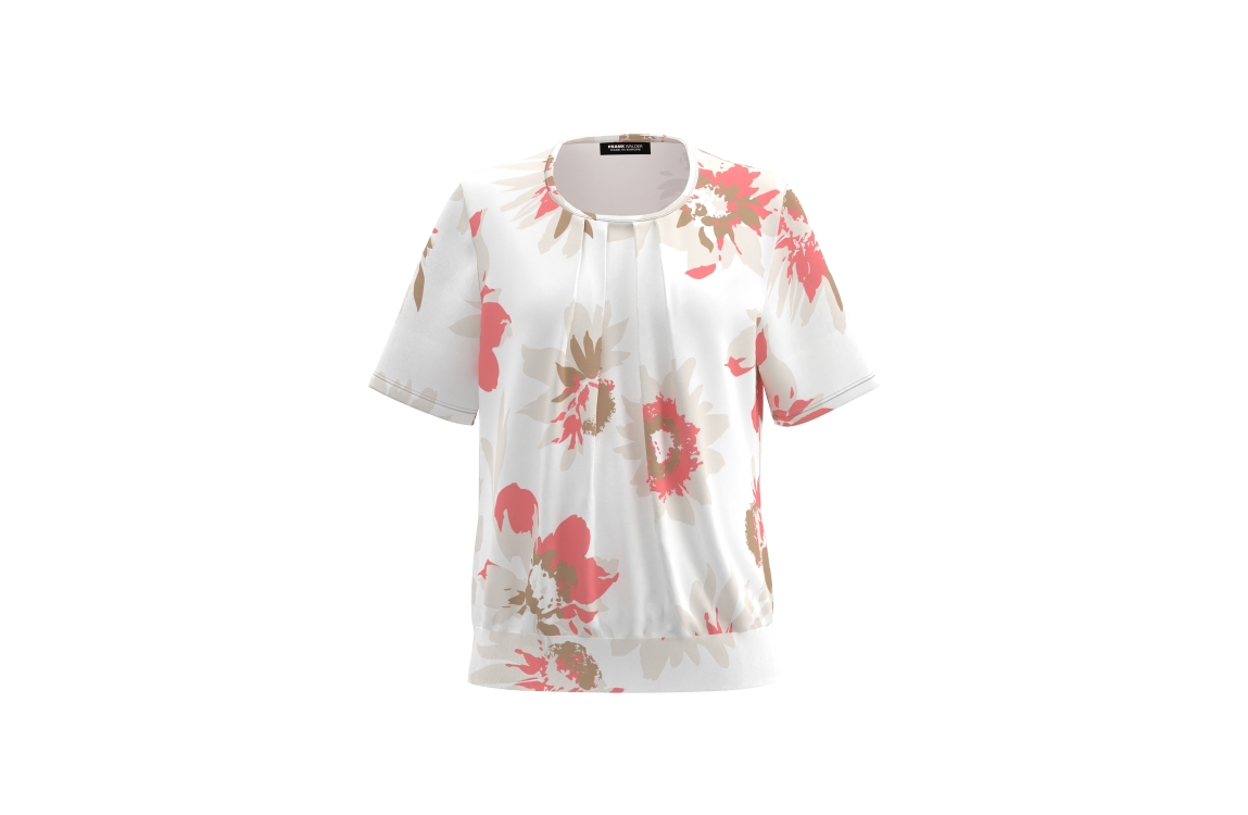 Frank Walder blouse NOS716422. Dit soepelvallende model is voorzien van een ronde hals en heeft korte mouwen. Deze beige blouse van Frank Walder is aan de onderzijde voorzien van een elastischeboord en is bewerkt met een bloemenmotief.