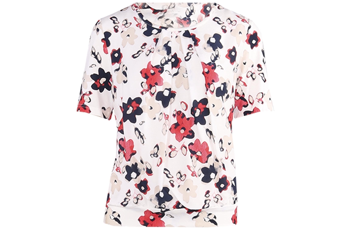 Frank Walder shirt NOS716422 836035. Dit rechtvallende model heeft een ronde halslijn en korte mouwen. Deze shirt van Frank Walder is all-over bewerkt met een grafische print in verschillende kleuren en is afgewerkt met plooidetails onder de halslijn.