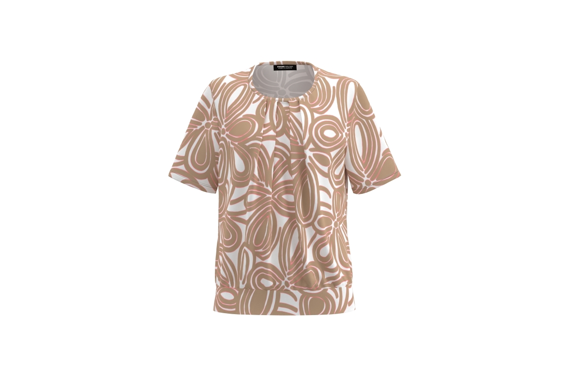 Frank Walder blouse NOS716422. Dit soepelvallende model is voorzien van een ronde hals en heeft korte mouwen. Deze beige blouse van Frank Walder is aan de onderzijde voorzien van een elastischeboord en is bewerkt met een bloemenmotief.