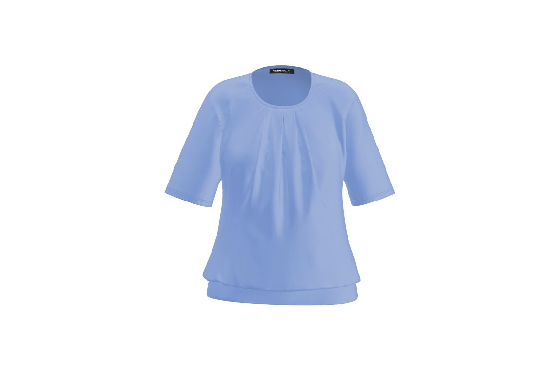 Frank Walder top 712404. Dit soepelvallend model is voorzien van een ronde hals en heeft korte mouwen. Deze blauwe top van Frank Walder is bewerkt met plooidetails bij de hals en is afgewerkt met een boord aan de onderzijde. Dit model is uitgevoerd in contrasterende stoffen.