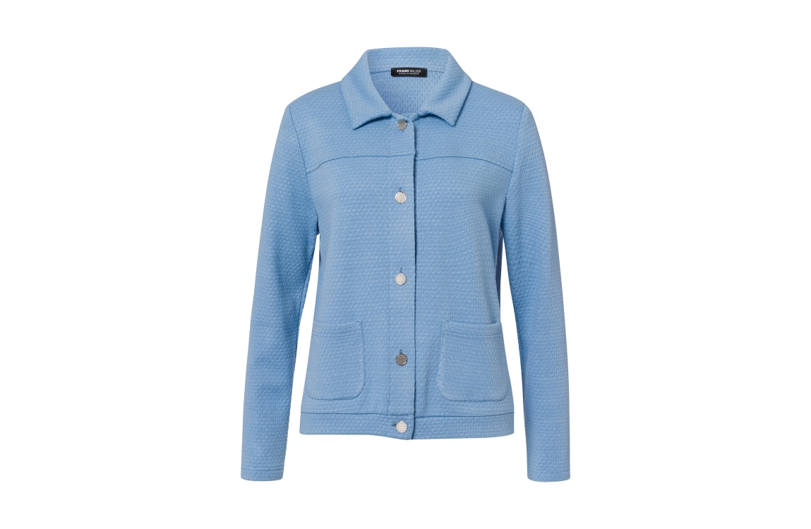 Frank Walder jasje NOS725004. Dit rechtvallend model is voorzien van een kraag en heeft lange mouwen. Dit blauwe jasje van Frank Walder sluit door middel van knopen en beschikt over twee opgestikte zakken.