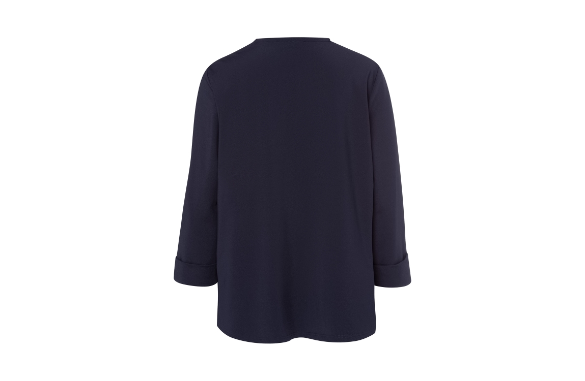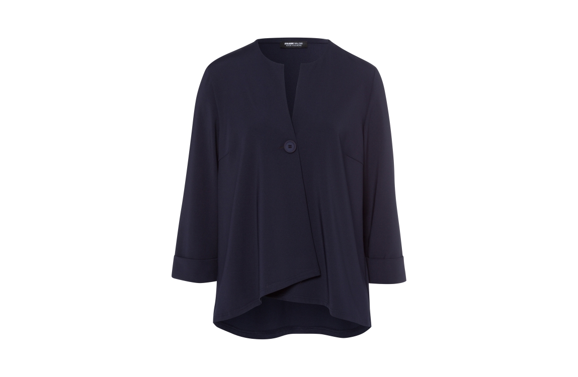 Frank Walder jasje NOS725305. Dit rechtvallend model is voorzien van een ronde hals met v-inkeping en heeft driekwart mouwen. Dit donkerblauwe jasje van Frank Walder sluit door middel van een knoop en is schuin afgesneden.