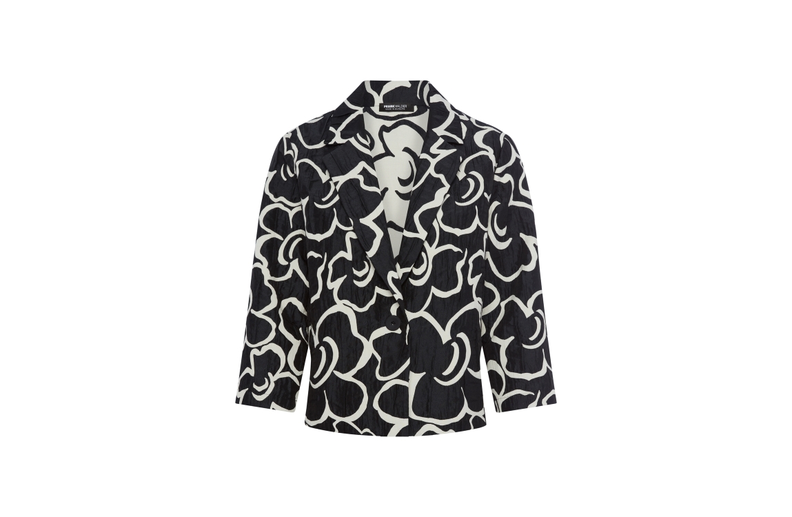 Frank Walder blazer NOS716314. Dit rechtvallende model heeft een reverskraag en 3/4 mouwen. Deze donkerblauwe blazer van Frank Walder is all-over bewerkt met een grafische print en sluit aan de voorzijde door middel van een knoop.