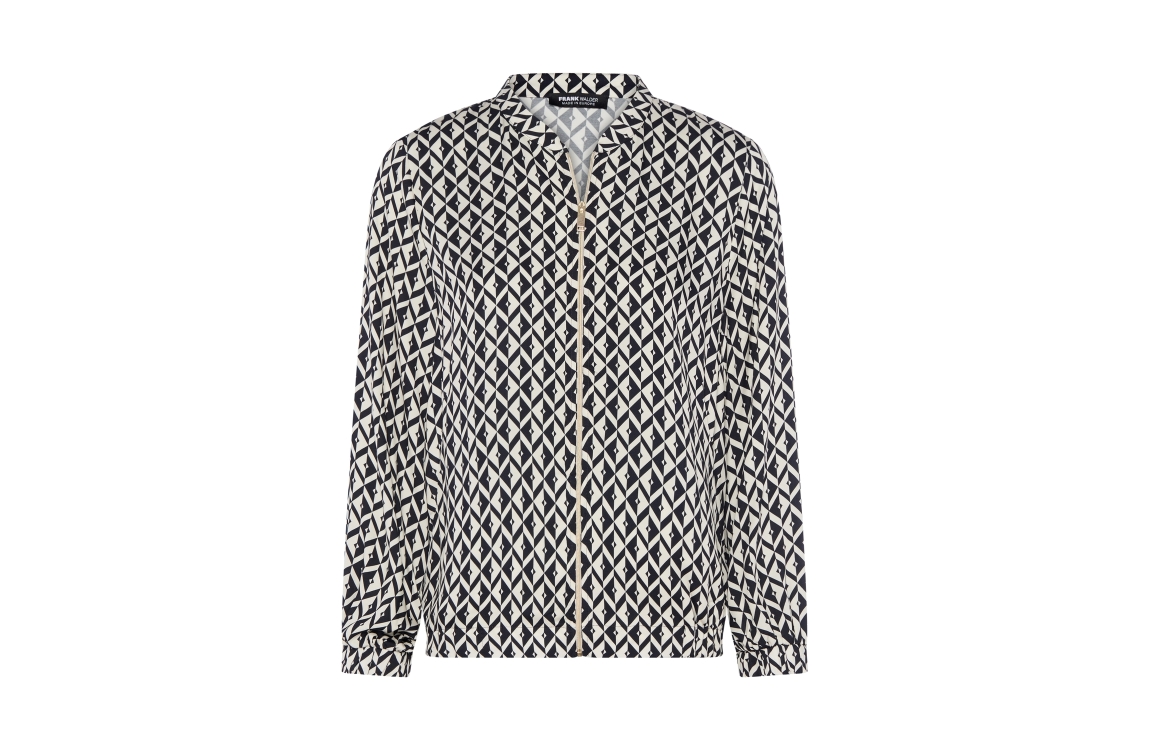 Frank Walder vest NOS716336 942059. Dit rechtvallende model heeft een ronde halslijn en lange mouwen. Deze donkerblauwe vest van Frank Walder sluit aan de voorzijde door middel van een rits en is voorzien van twee steekzakken. Het model is all-over bewerkt met een grafische print en beschikt over een elastische zoom.