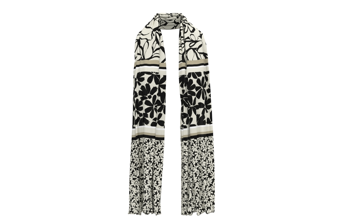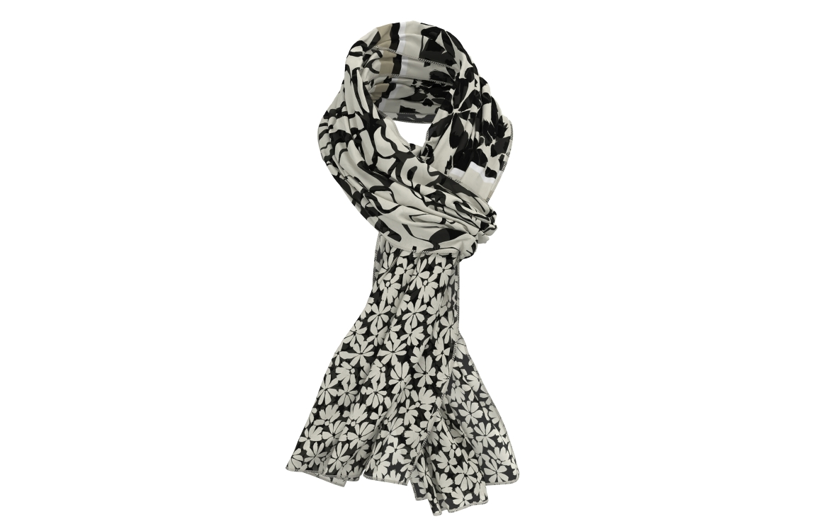 Frank Walder sjaal NOS725770. Dit rechthoekig model is bewerkt met verschillende prints in de kleuren zwart en beige.