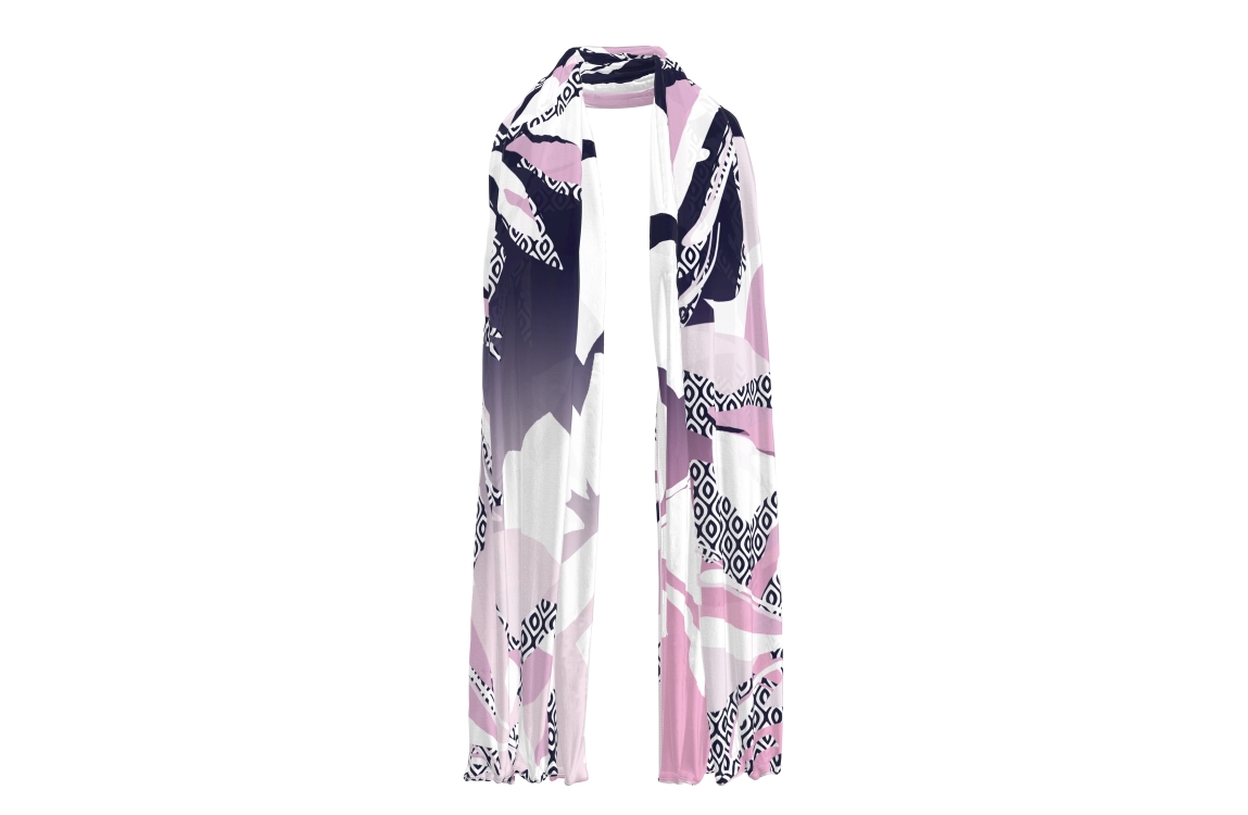 Frank Walder sjaal 715.770 0095. Dit rechthoekige model is all-over bewerkt met verschillende printen in de kleuren: roze, blauw, wit en paars.