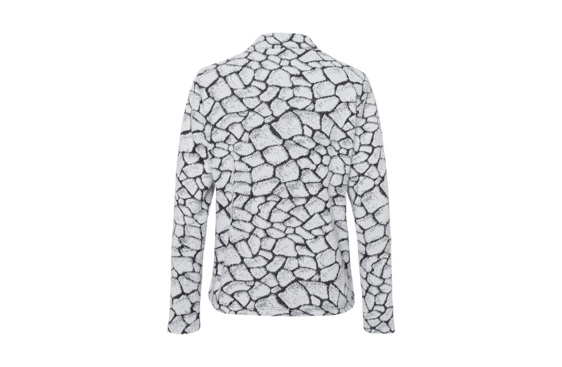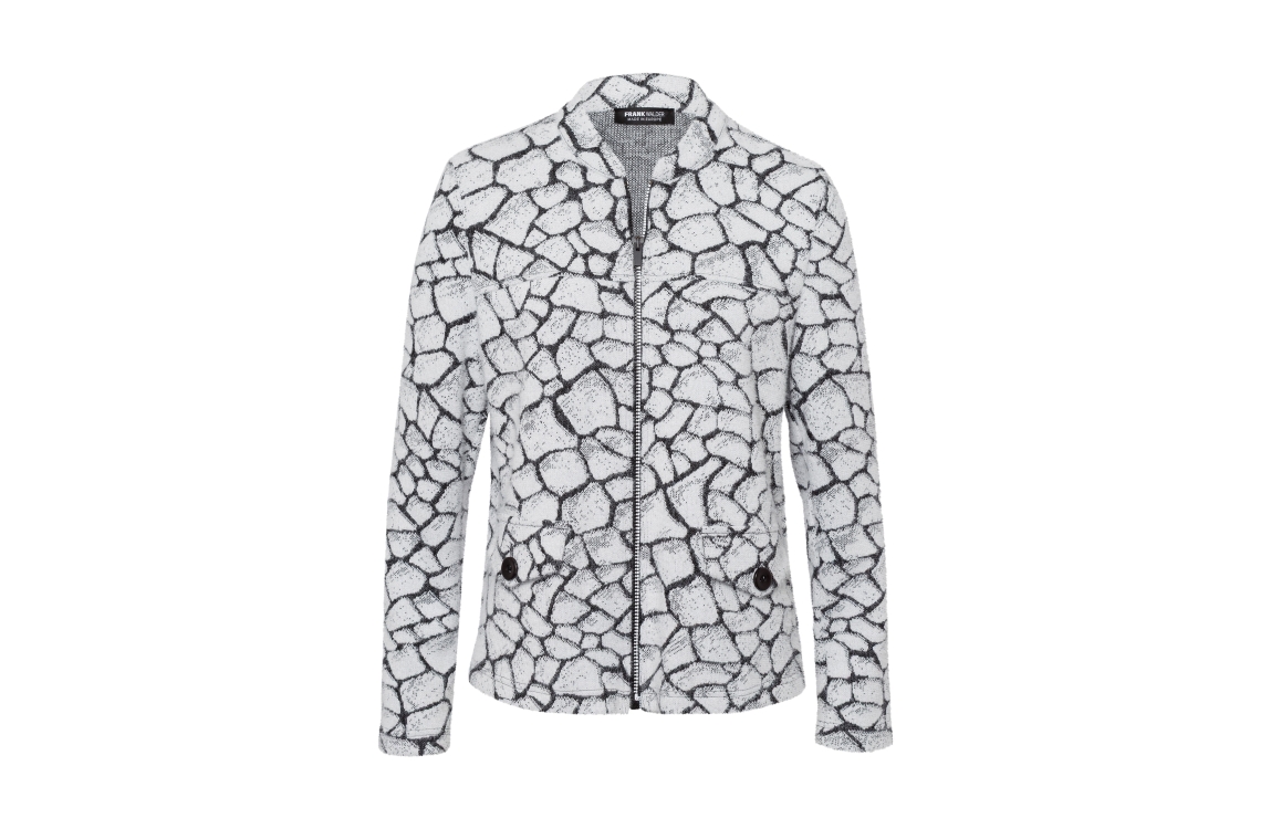 Frank Walder vest 725/002/00662. Dit rechtvallende model is voorzien van een ronde hals en heeft lange mouwen. Dit zwart/witte vest van Frank Walder sluit aan de voorzijde door middel van een rits en is voorzien van twee decoratieve klepzakken afgewerkt met een knoop. Dit model is bewerkt met een 'stenen' print.