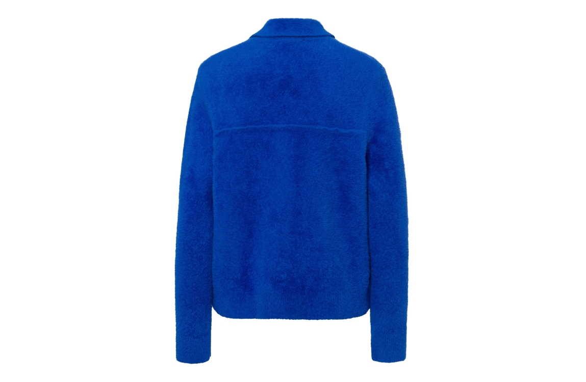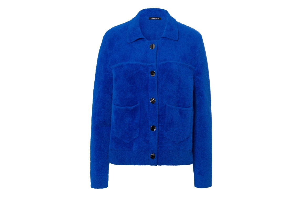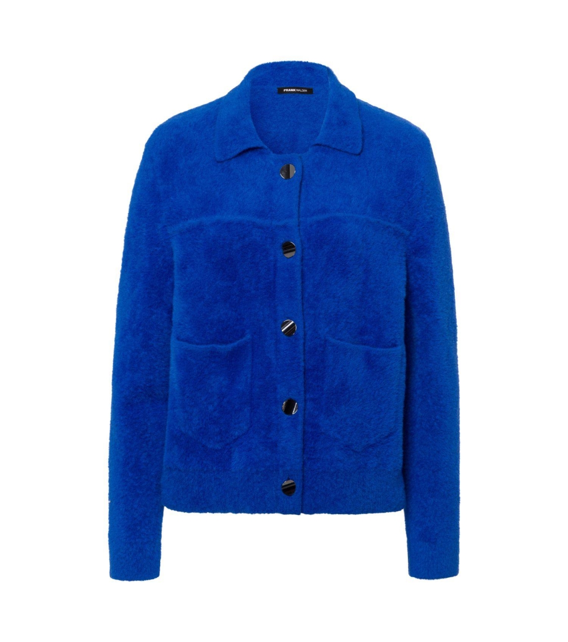 Frank Walder NOSStrick 527 Blue. Dit rechtvallende model is voorzien van een kraag en heeft lange mouwen. Dit blauwe jasje van Frank Walder sluit door middel van knopen en beschikt over twee opgestikte zakken.